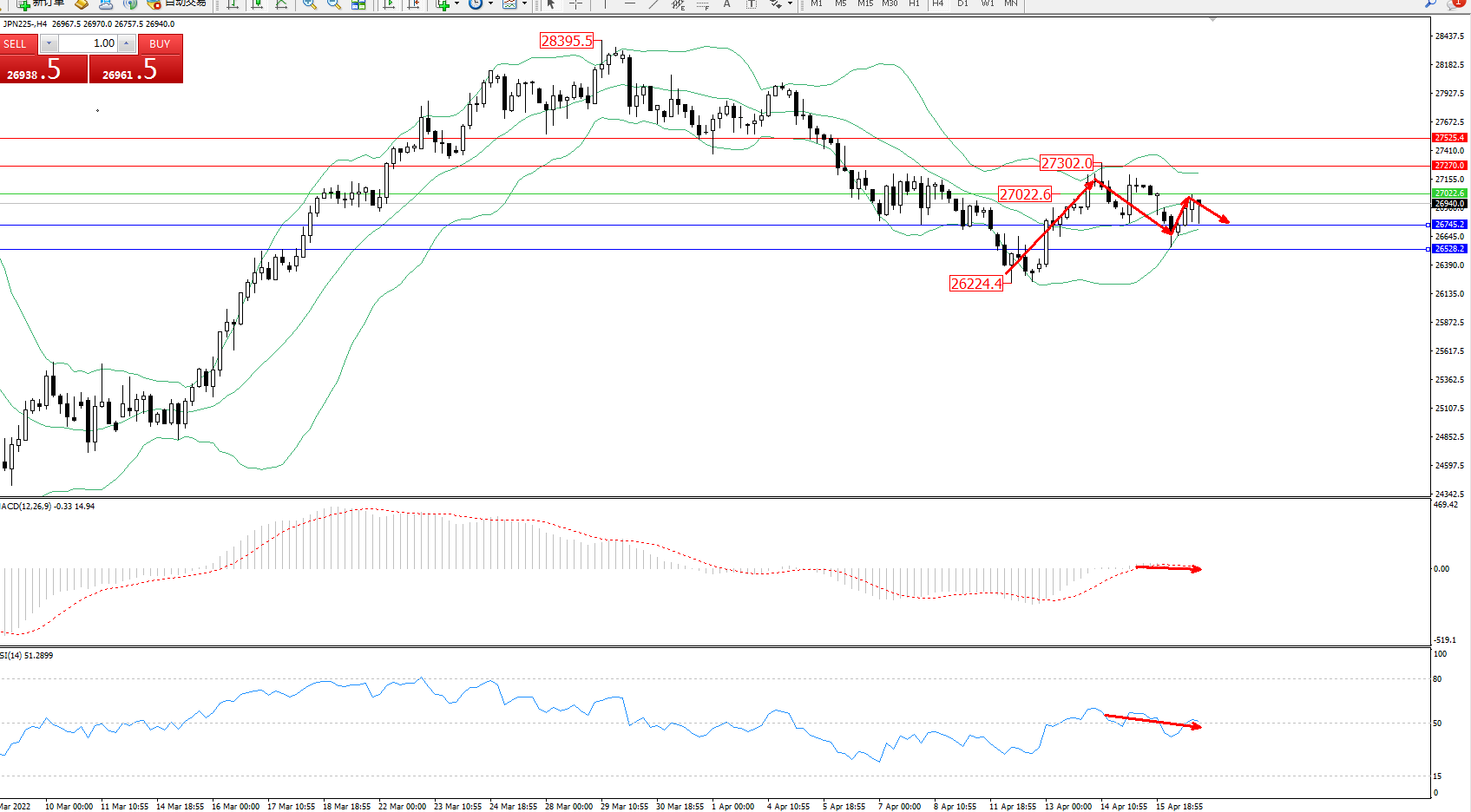 日经指数JPN225——4小时K线图显示: