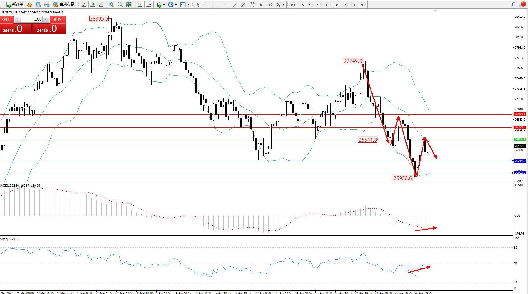 日经225指数4月27日(周三)收盘下跌322.61点,跌幅1.21%,报26377.50点。日本首相岸田文雄表示已做好应对物价上涨的对策,他还表示将通过经济措施稳定汇率;日本央行宣布将在4月27日和28日进行固定利率债券购买,并可能会根据需要改变债券购买计划;日本方面批准为有限人群接种第四针新冠疫苗。