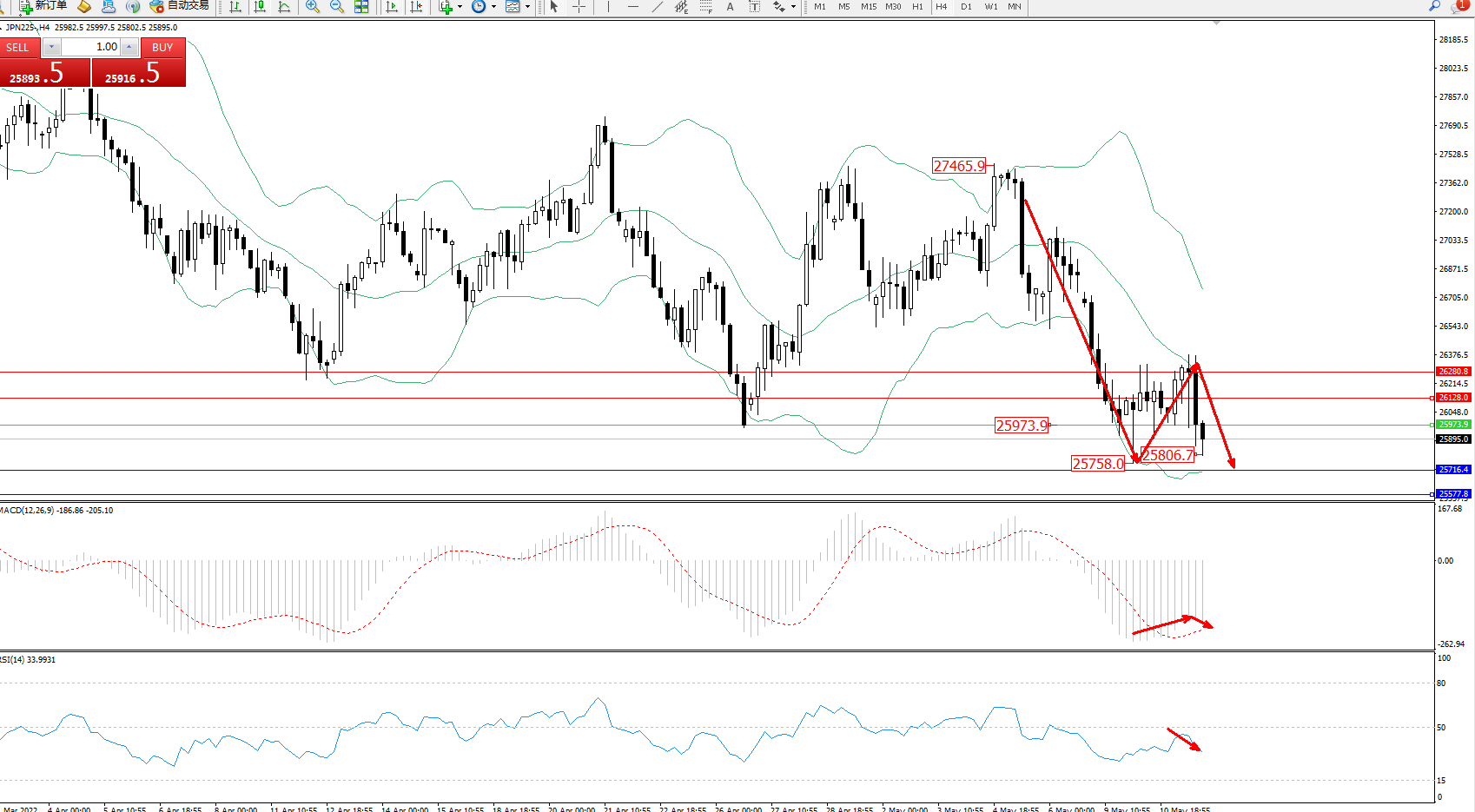 日经指数JPN225——4小时K线图显示: