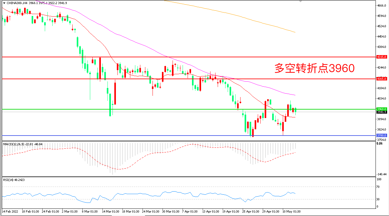 4小时图看,沪深300连续拉升后横盘震荡,短线走势回暖,均线系统走平,3960成为多空分水岭,MACD绿柱缩短,RSI指标走平,日内小幅反弹概率较大。