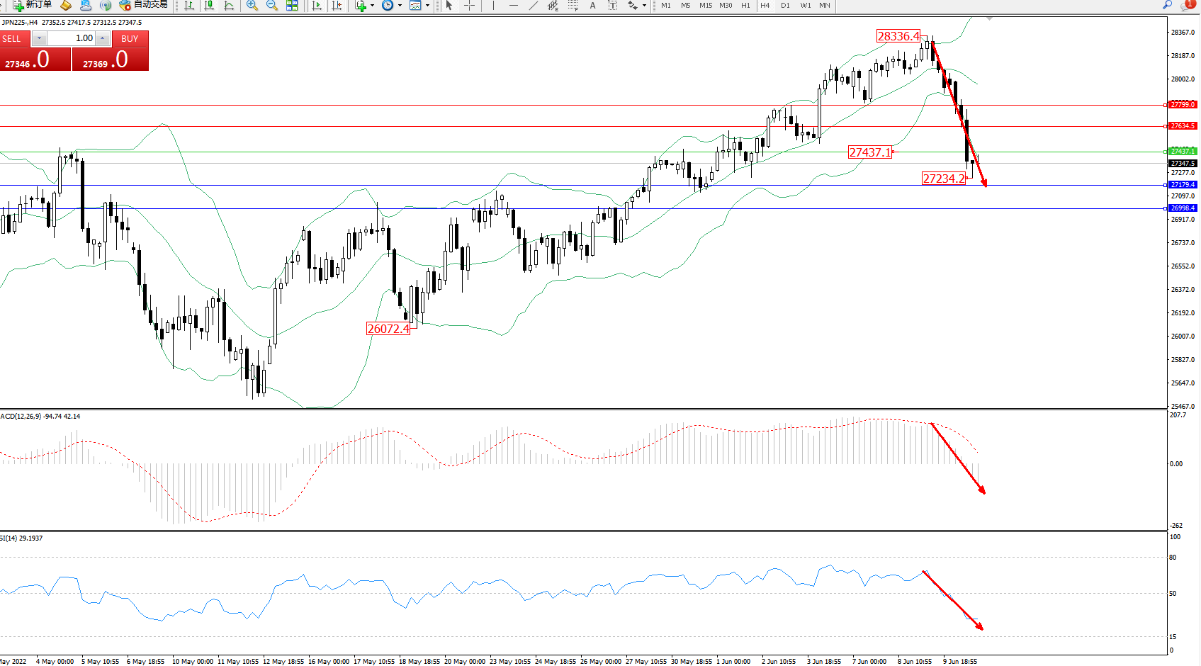 日经指数JPN225——4小时K线图显示: