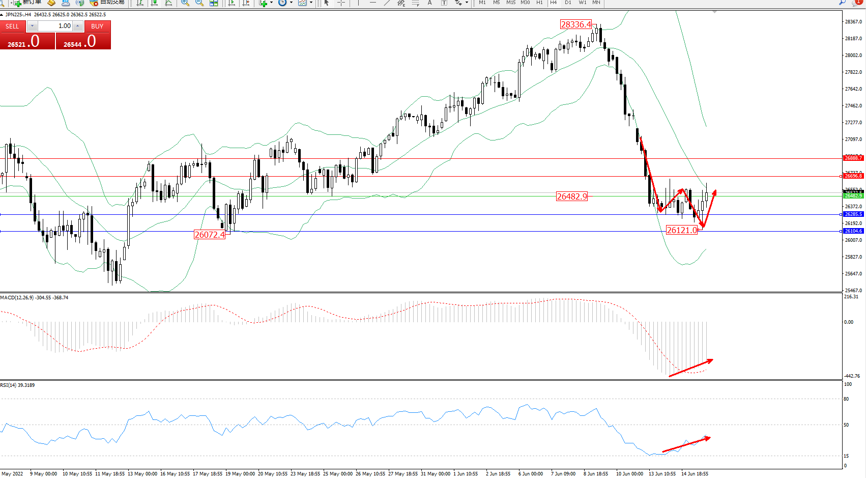 日经指数JPN225——4小时K线图显示: