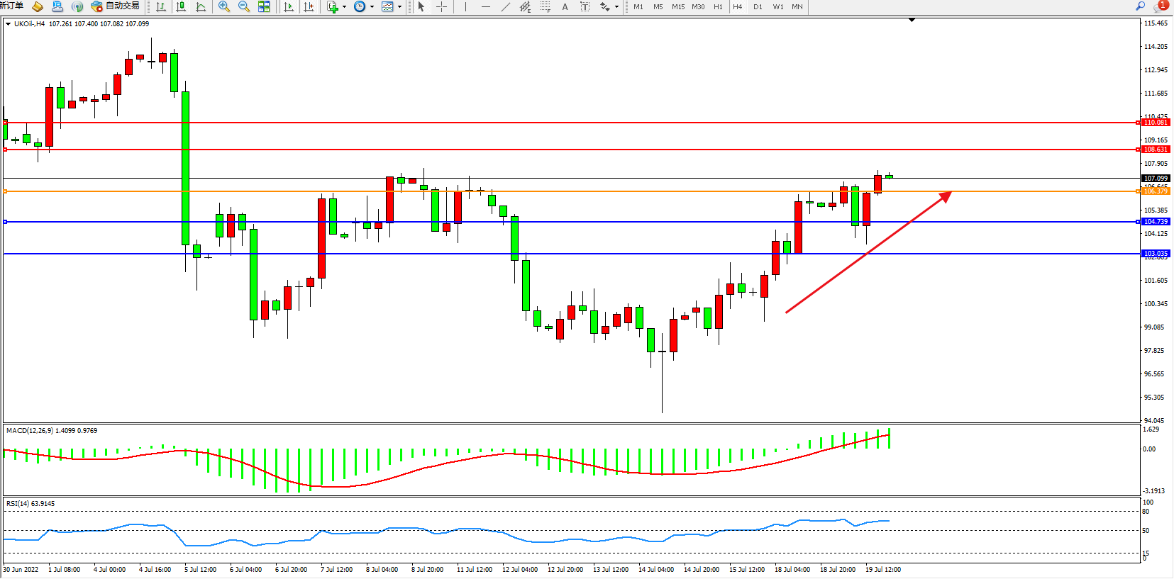交易策略:106.379上方看涨,目标108.631、110.081