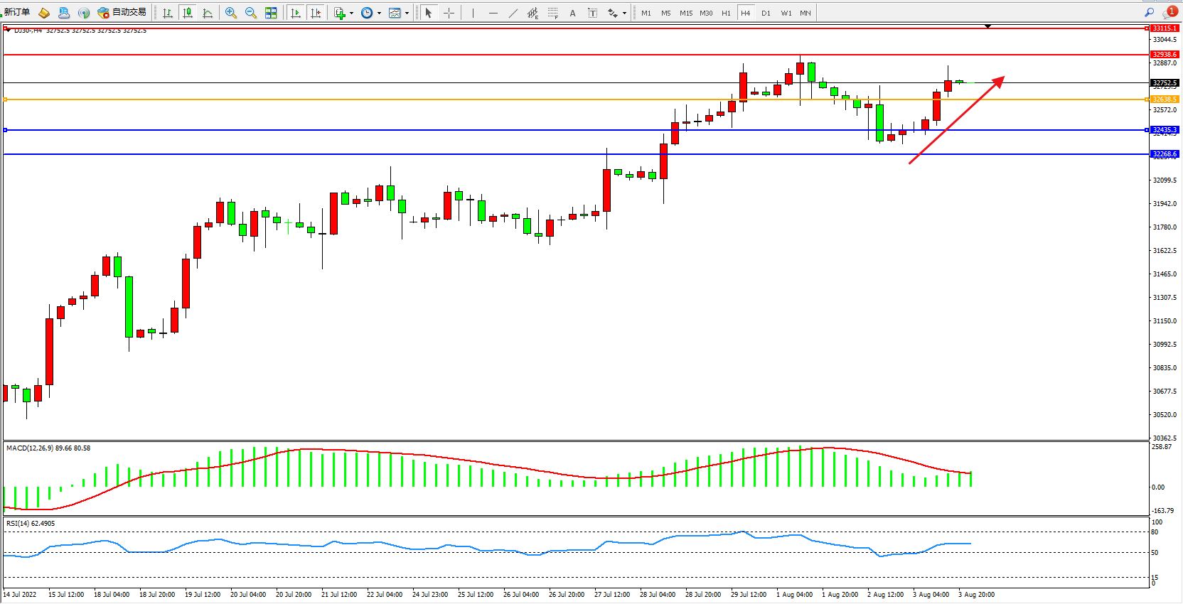 道琼斯指数DJ30——4小时K线图显示: