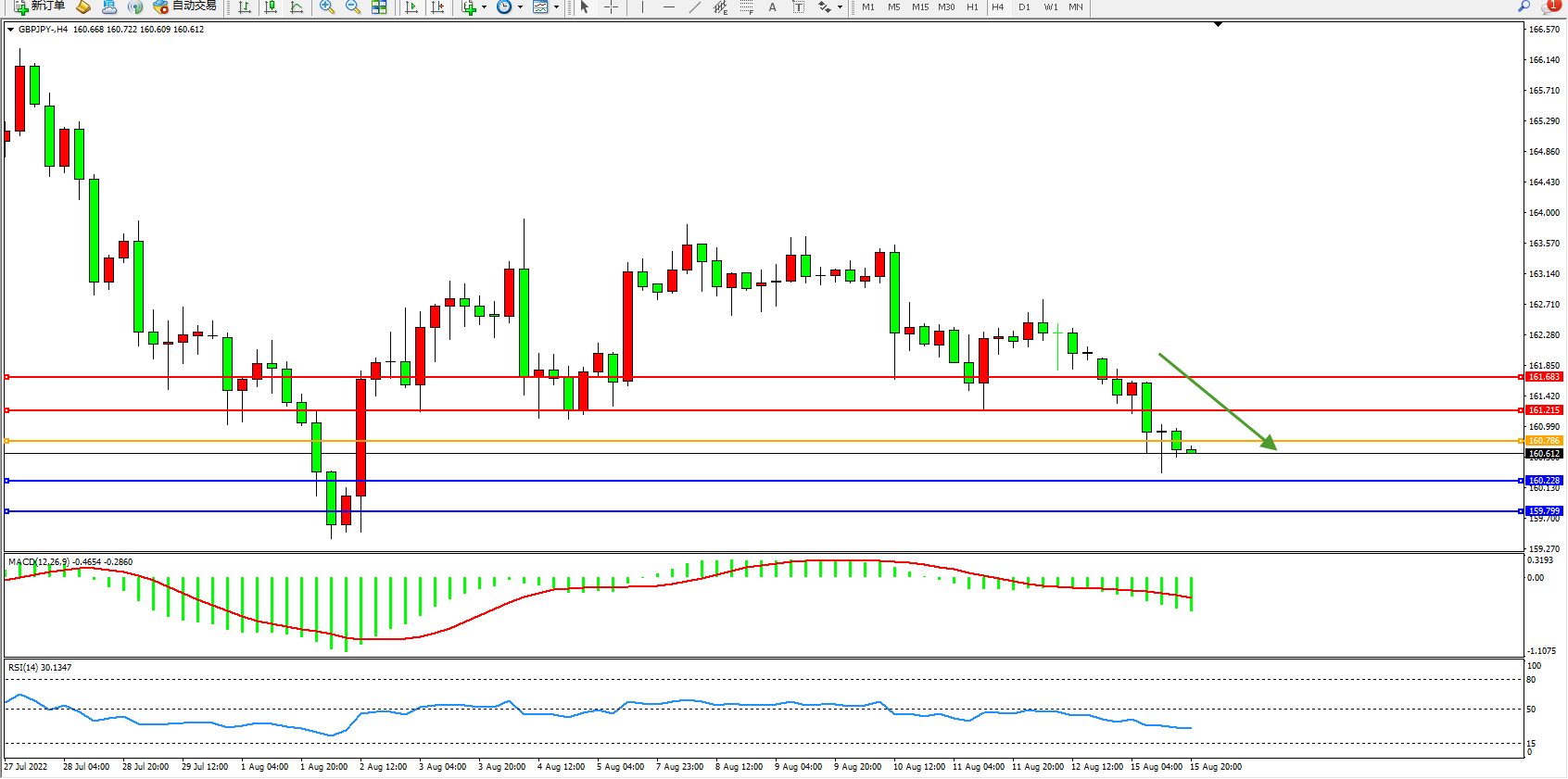 交易策略:160.786下方看跌,目标160.228、159.799
