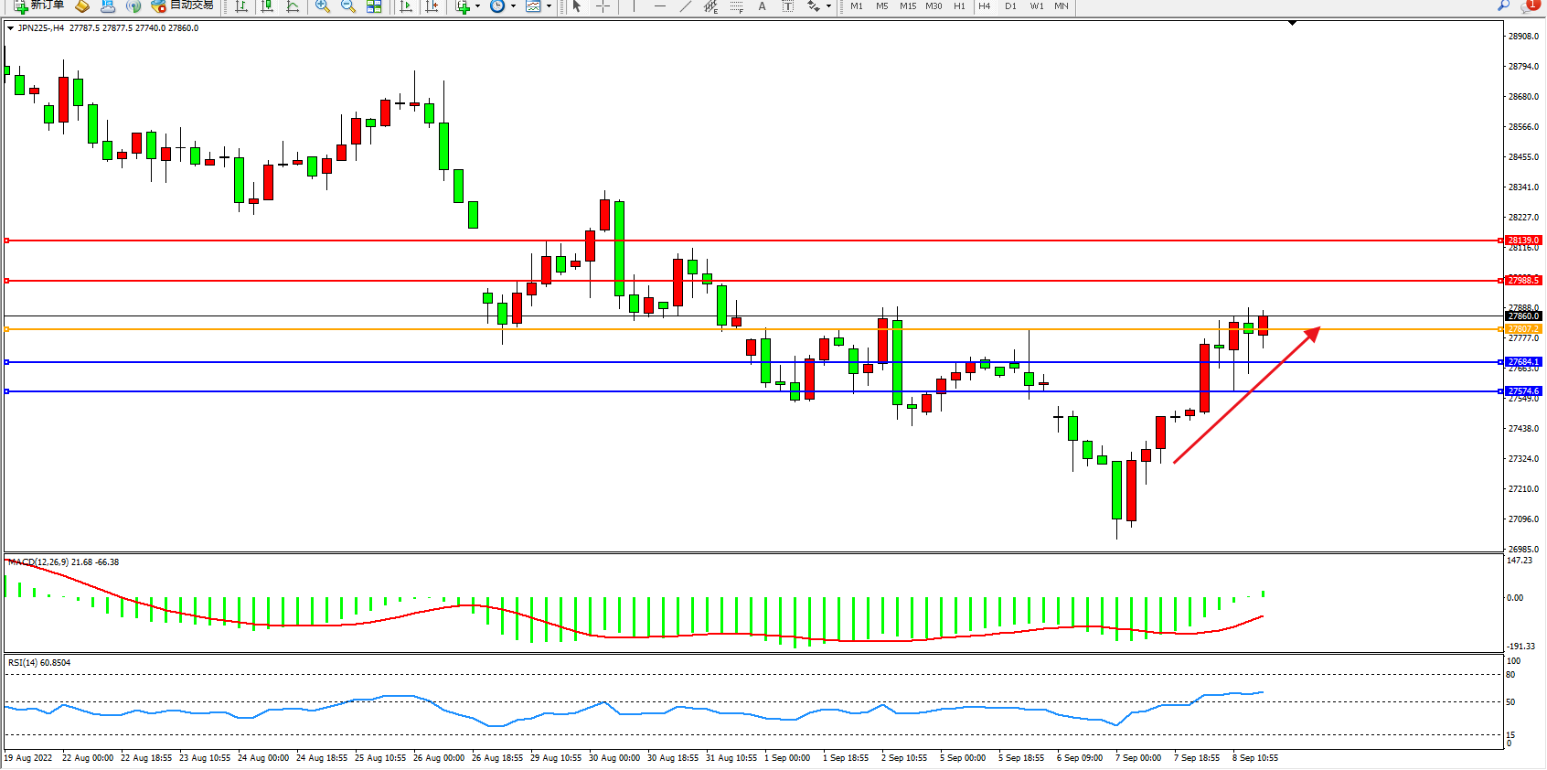 日经指数JPN225——4小时K线图显示:
