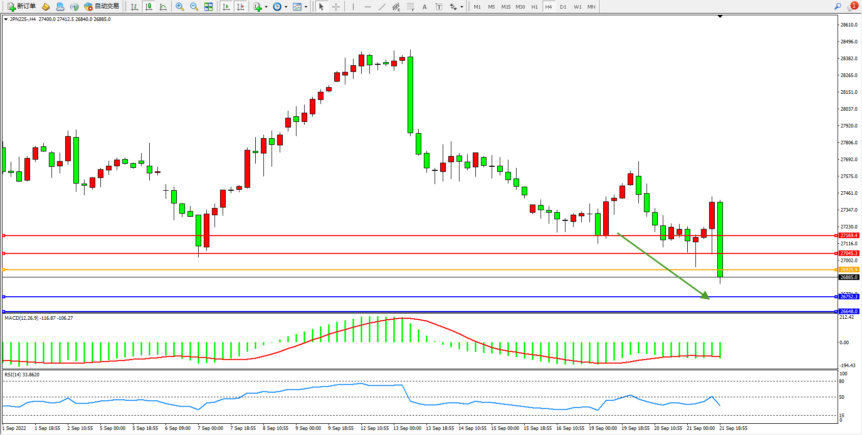 日经指数JPN225——4小时K线图显示: