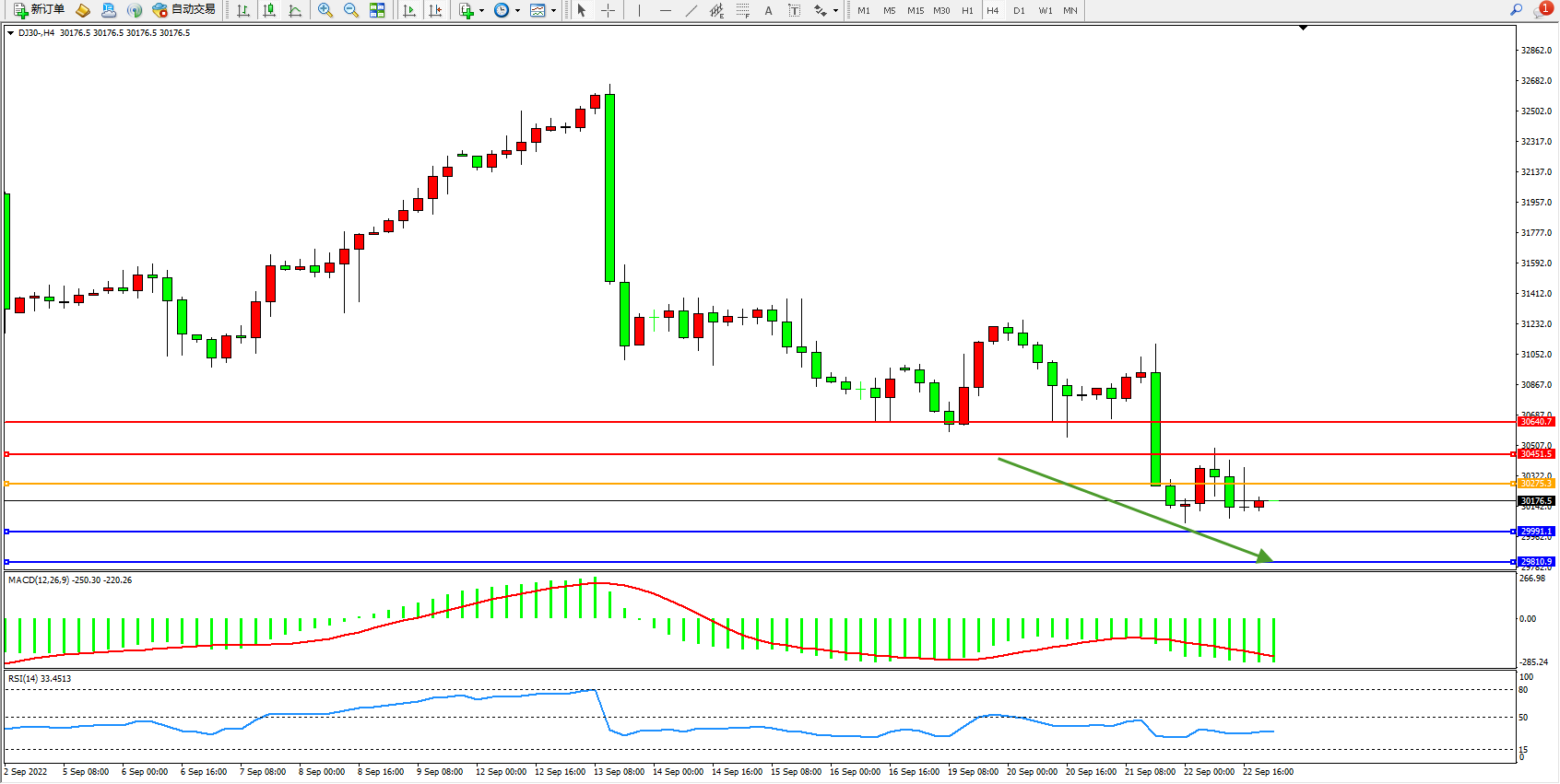 道琼斯指数DJ30——4小时K线图显示: