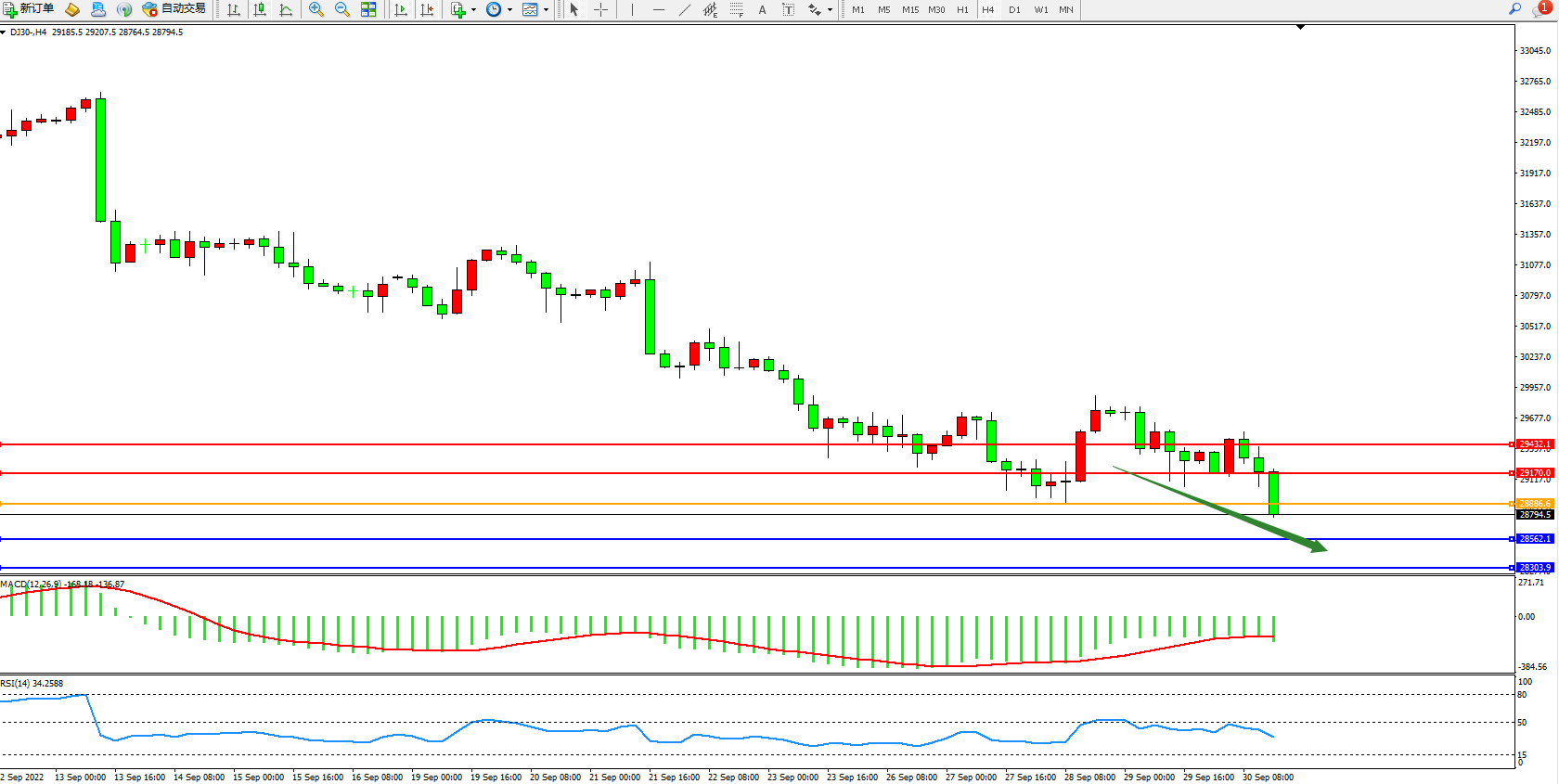 道琼斯指数DJ30——4小时K线图显示: