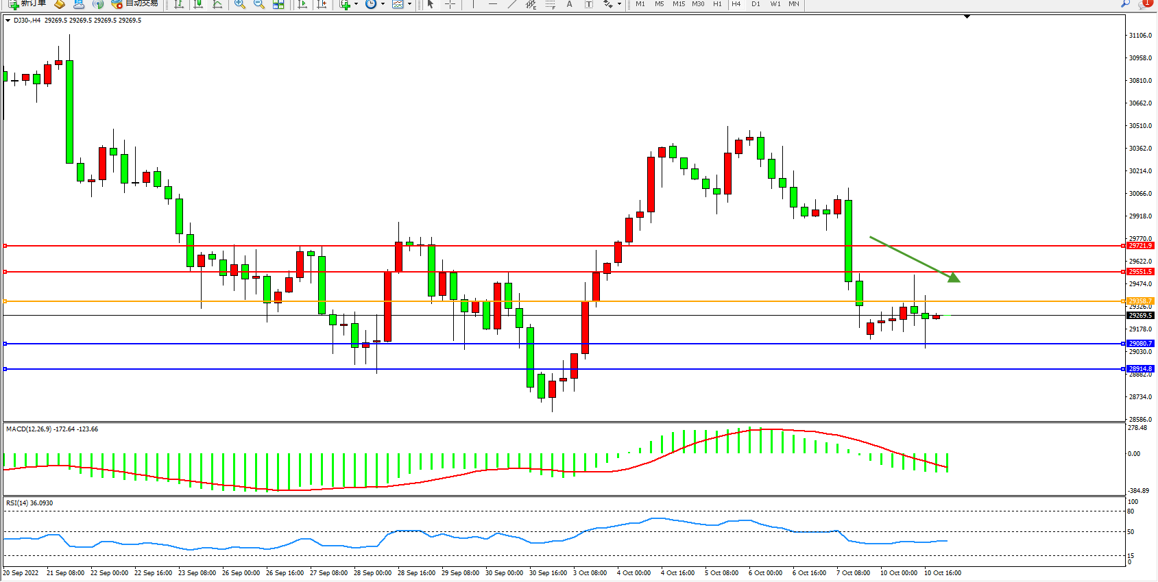 道琼斯指数DJ30——4小时K线图显示: