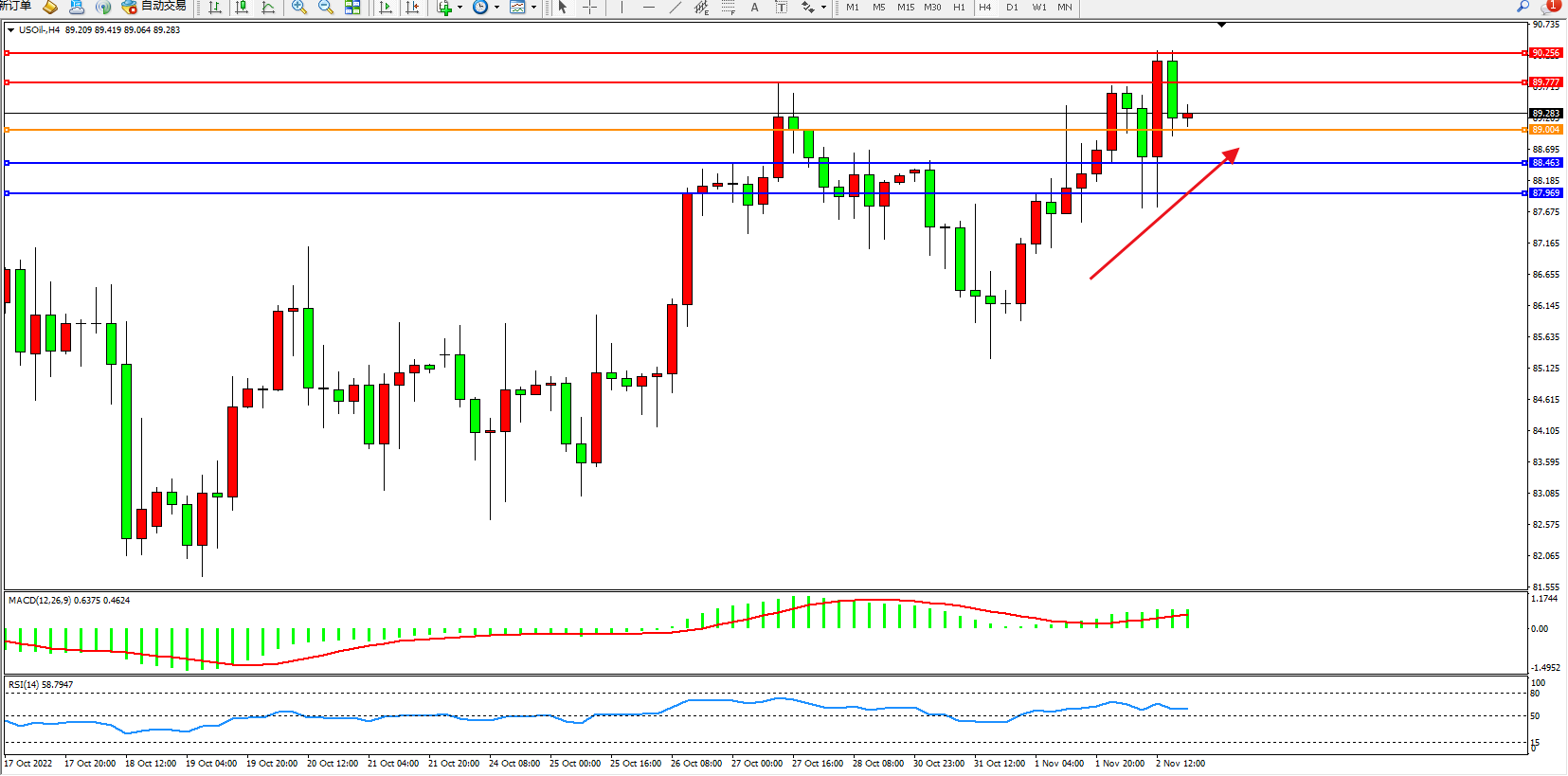 交易策略:89.004上方看涨,目标89.777、90.256