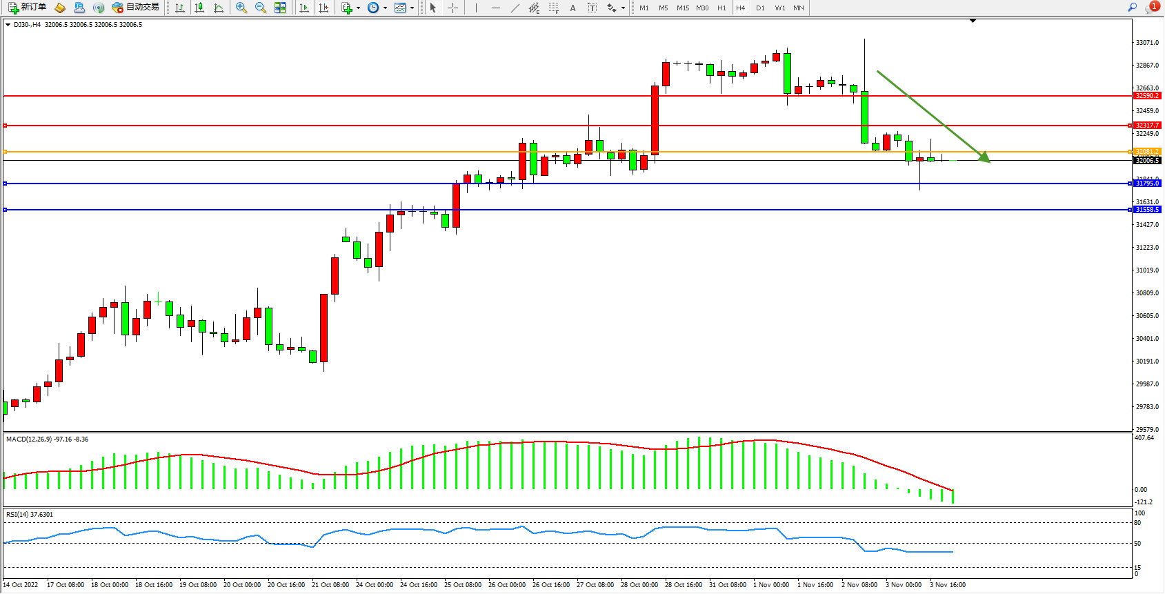 道琼斯指数DJ30——4小时K线图显示: