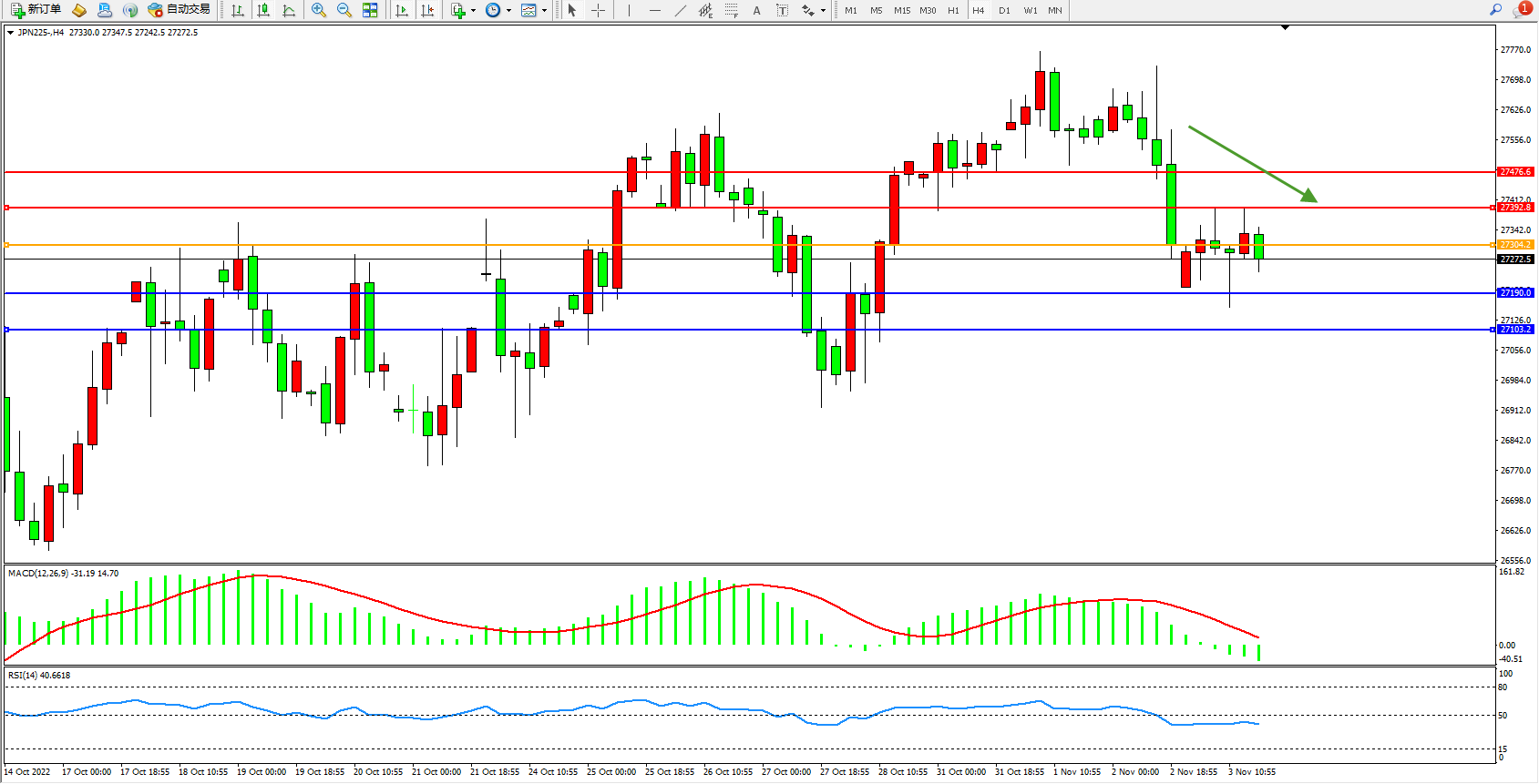 日经指数JPN225——4小时K线图显示:
