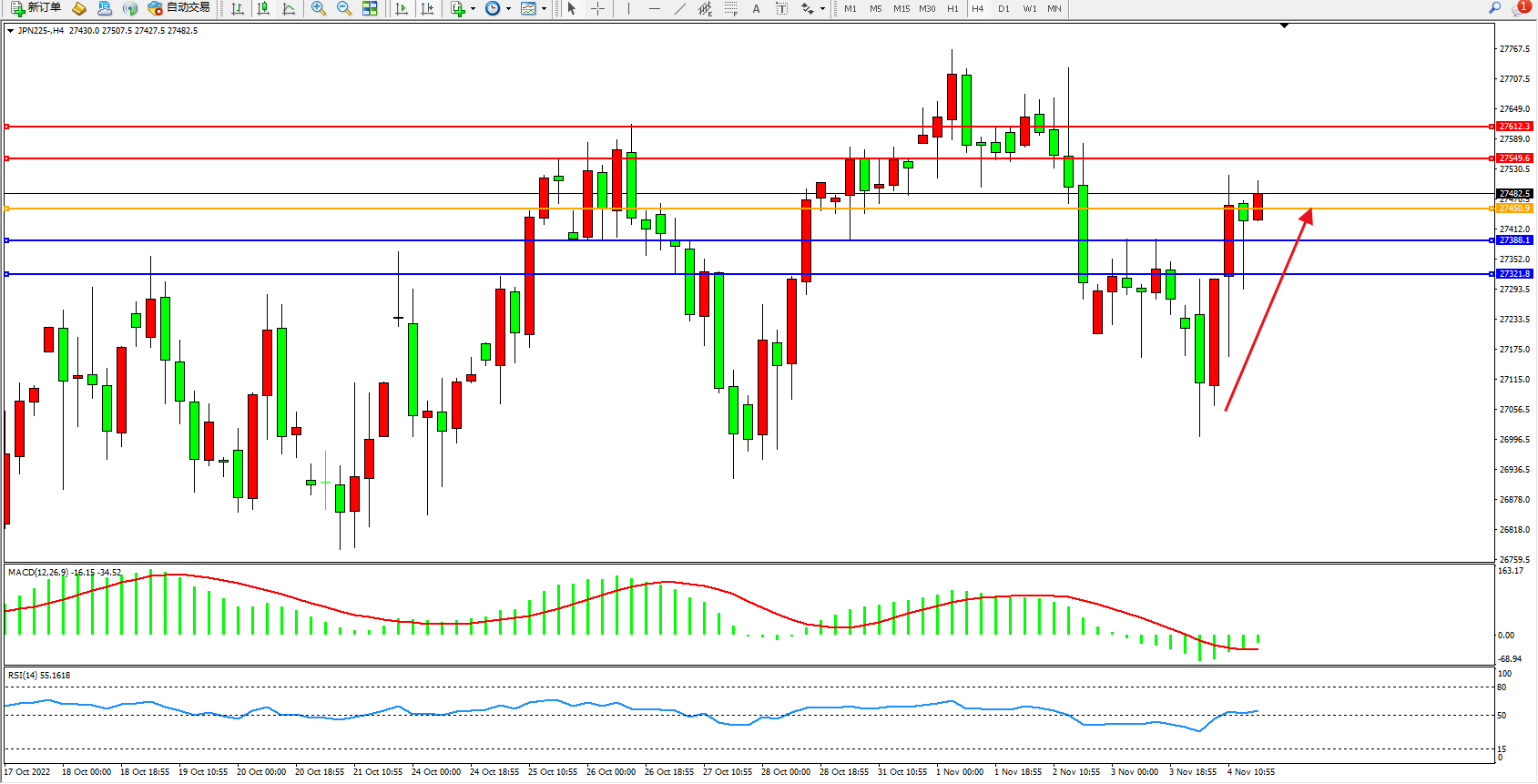 日经指数JPN225——4小时K线图显示: