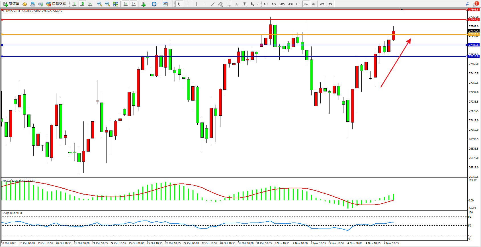 日经指数JPN225——4小时K线图显示: