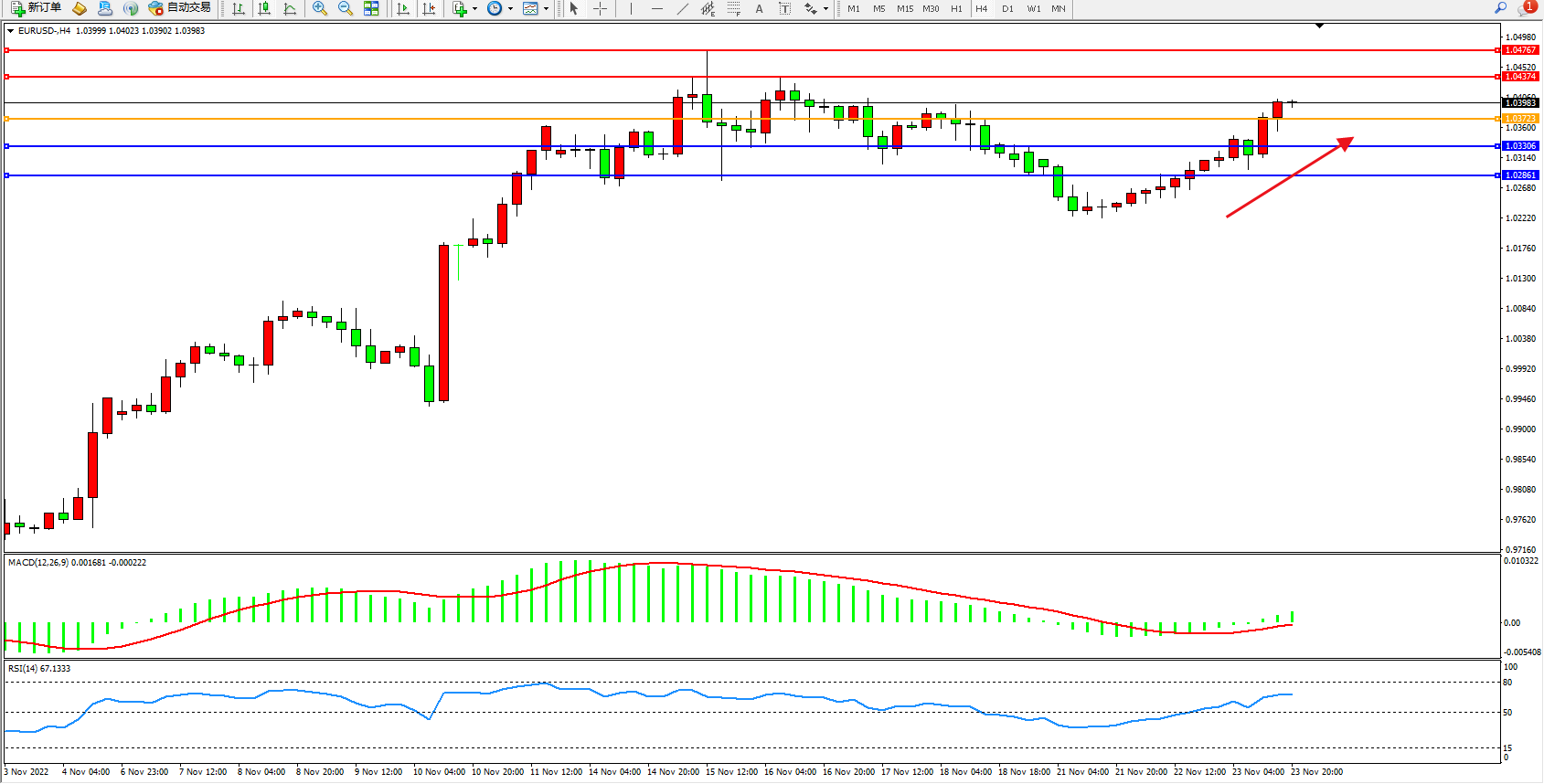 交易策略:1.03723上方看涨,目标1.04374、1.04767
