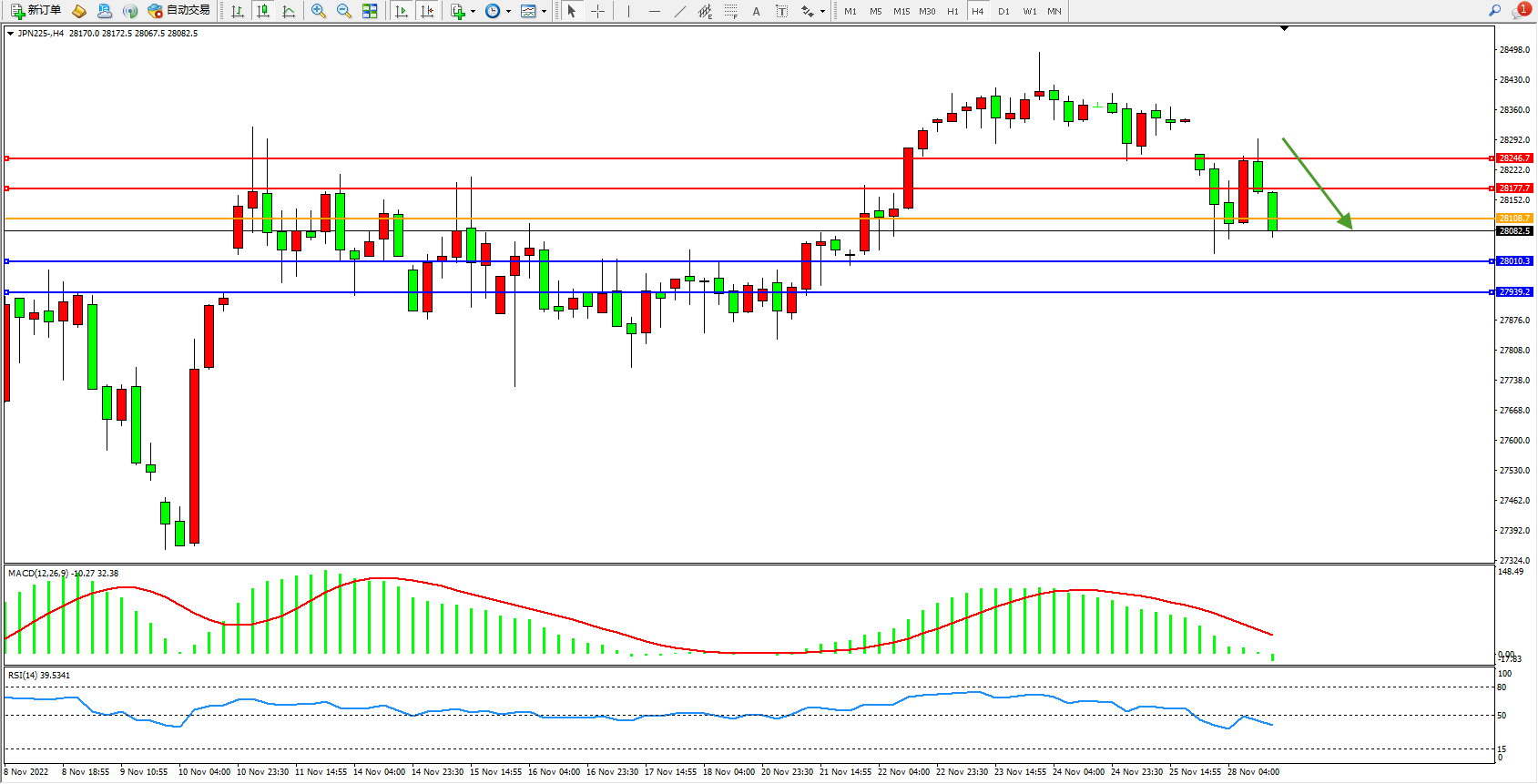 日经指数JPN225——4小时K线图显示: