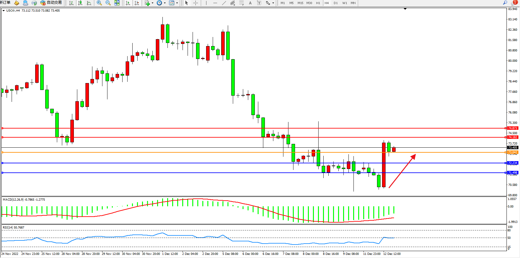 交易策略:73.042上方看涨,目标74.182、74.871