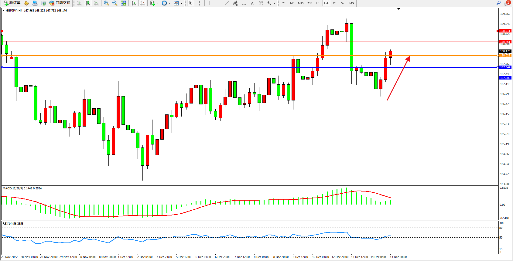 交易策略:168.023上方看涨,目标168.461、168.811