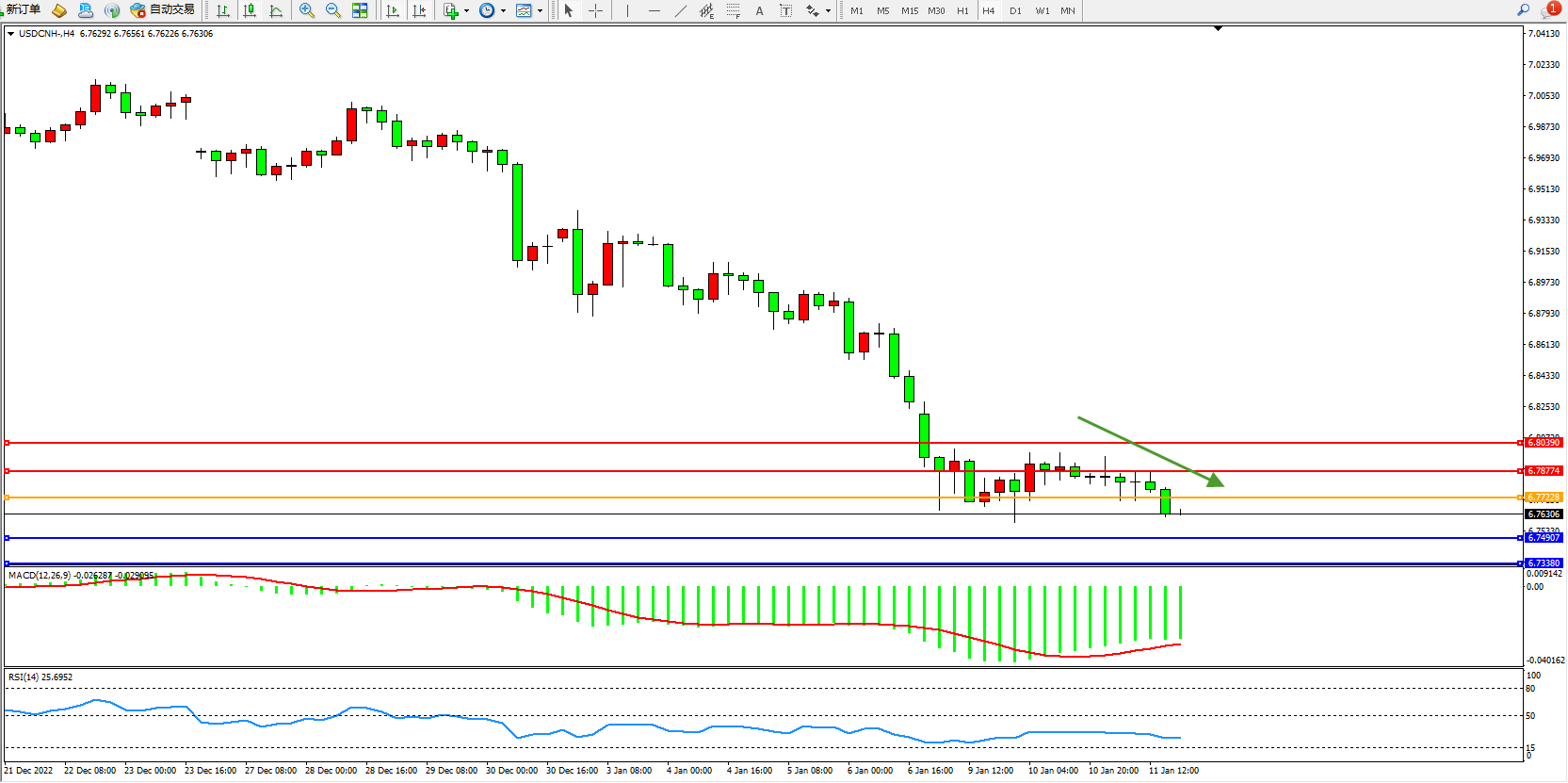 交易策略:6.77228下方看跌,目标6.74907、6.73380