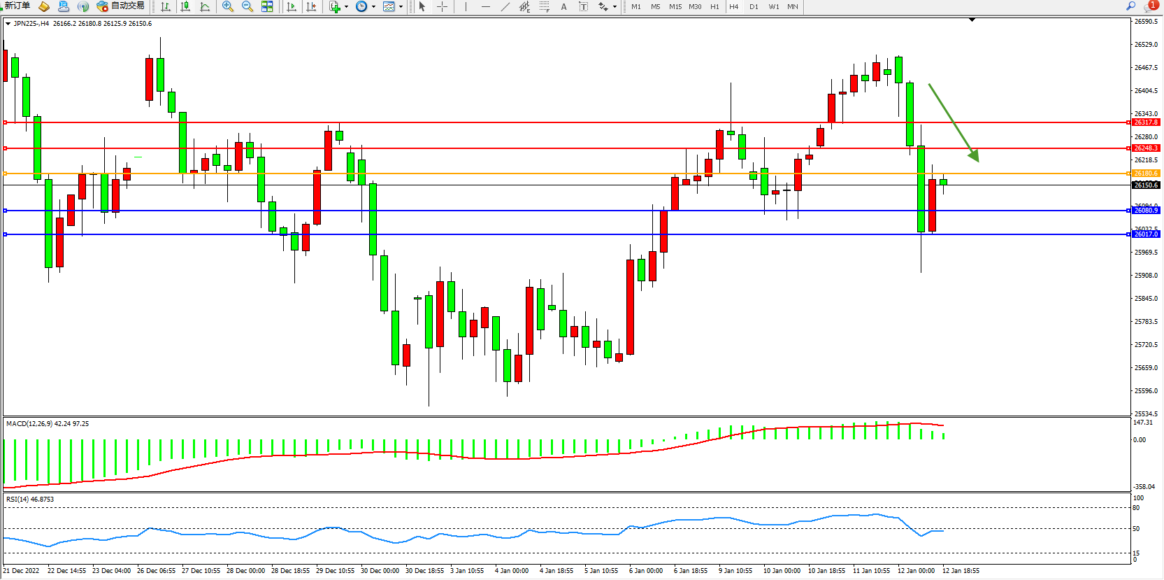 日经指数JPN225——4小时K线图显示: