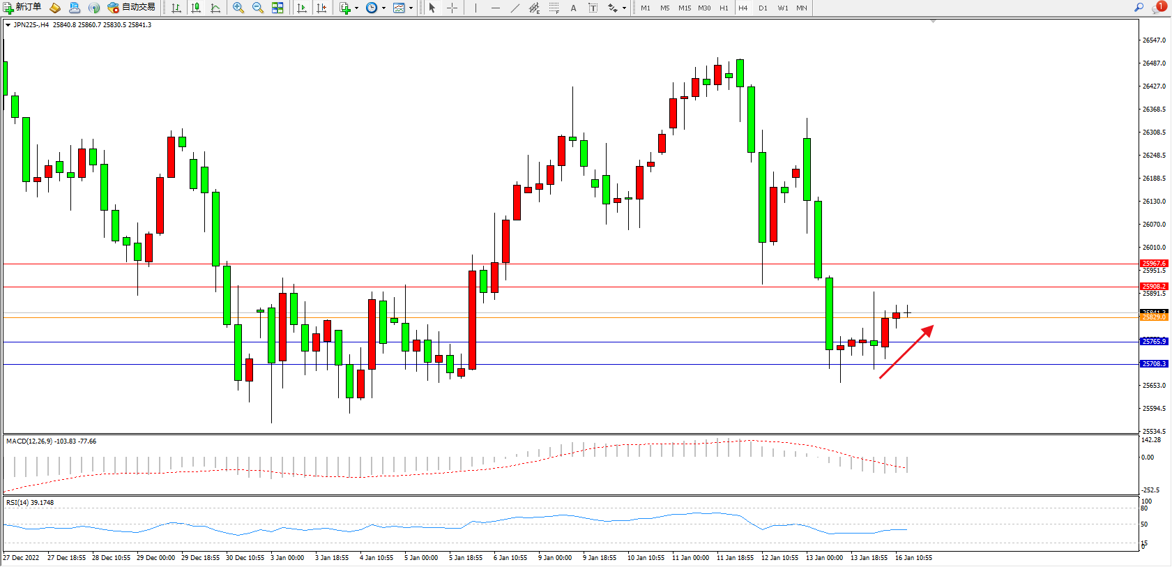 日经指数JPN225——4小时K线图显示: