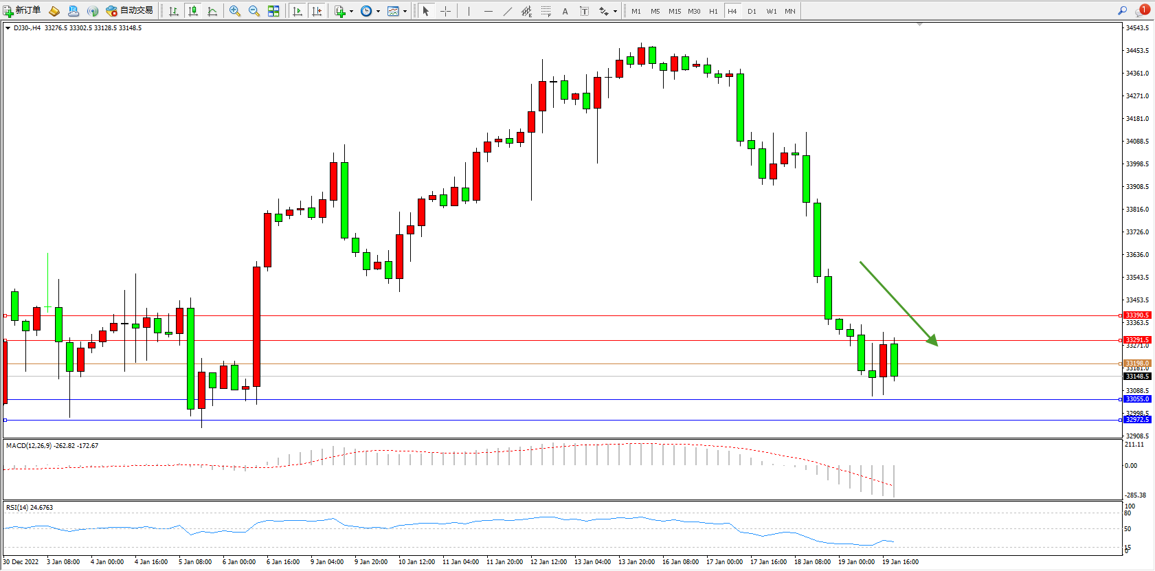 道琼斯指数DJ30——4小时K线图显示: