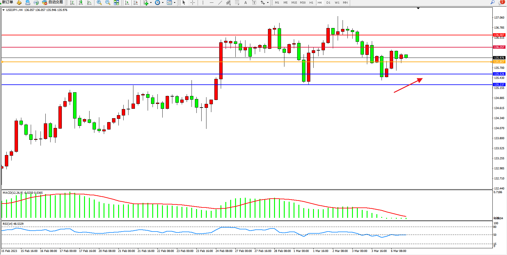 交易策略:135.857上方看涨,目标136.257 136.587