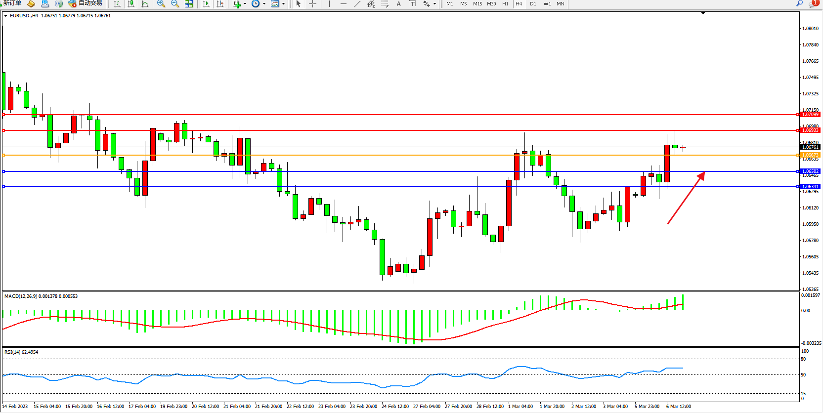 4小时图看:多头动力维持震荡上移,短期看涨趋势依旧,市场整体不断拉升,MACD指标处于0轴线上側徘徊,RSI指标处于50均衡线上側弱势整理;