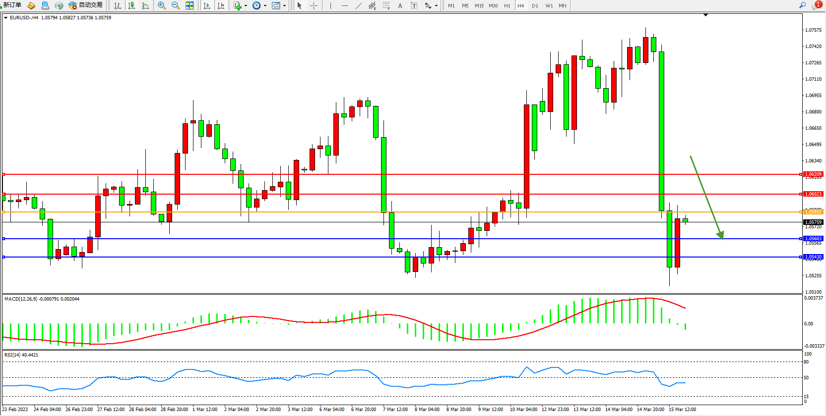 欧元美元EURUSD—4小时K线图显示:
