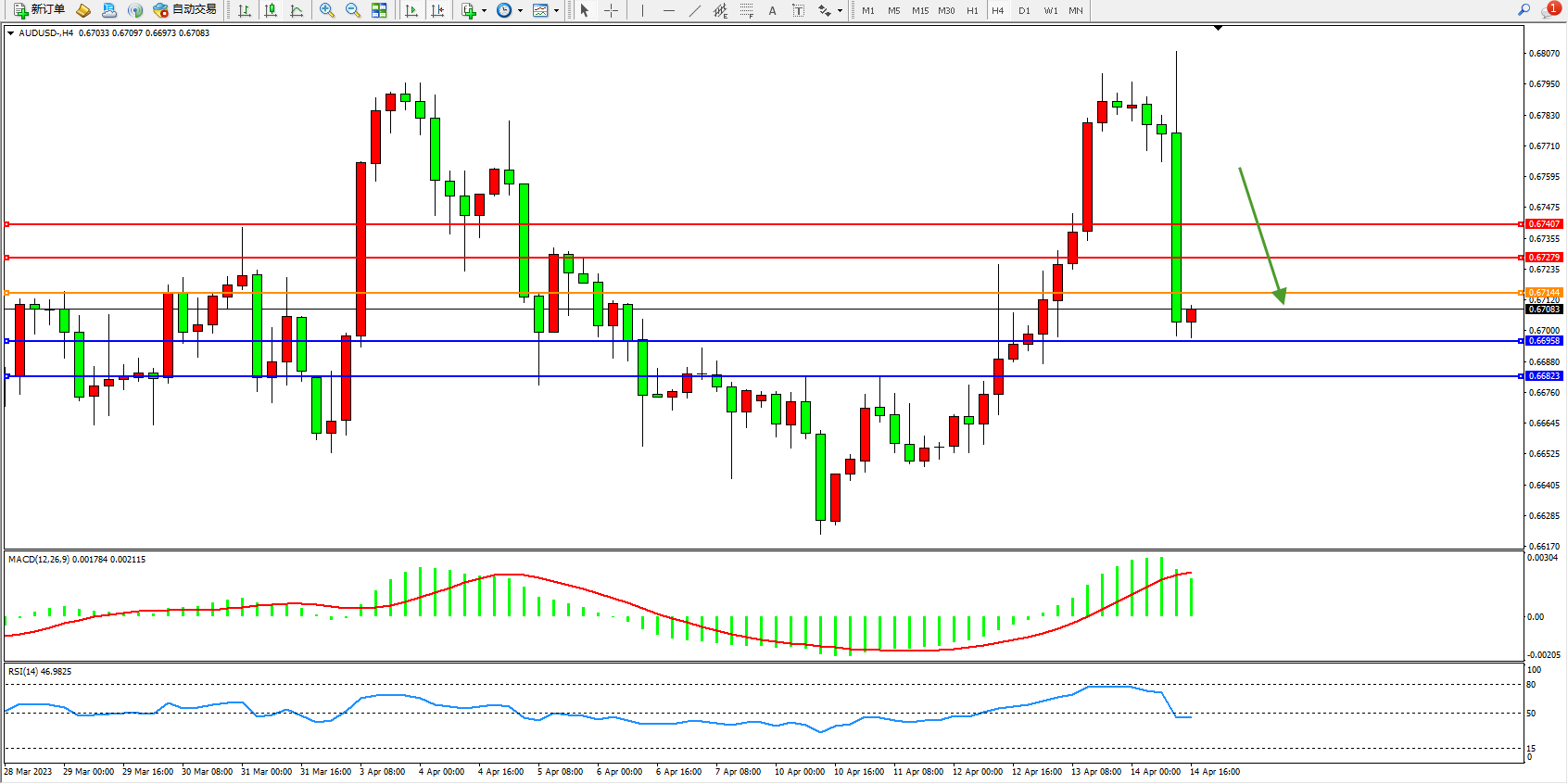 交易策略:0.67144下方看跌,目标0.66985 0.66823