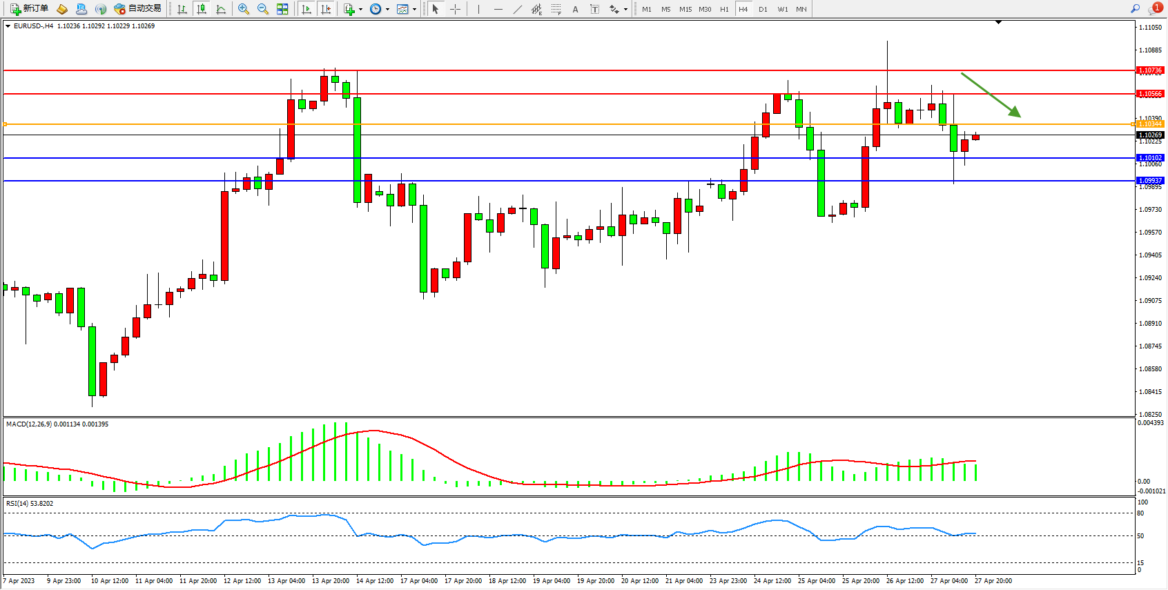 欧元美元EURUSD—4小时K线图显示: