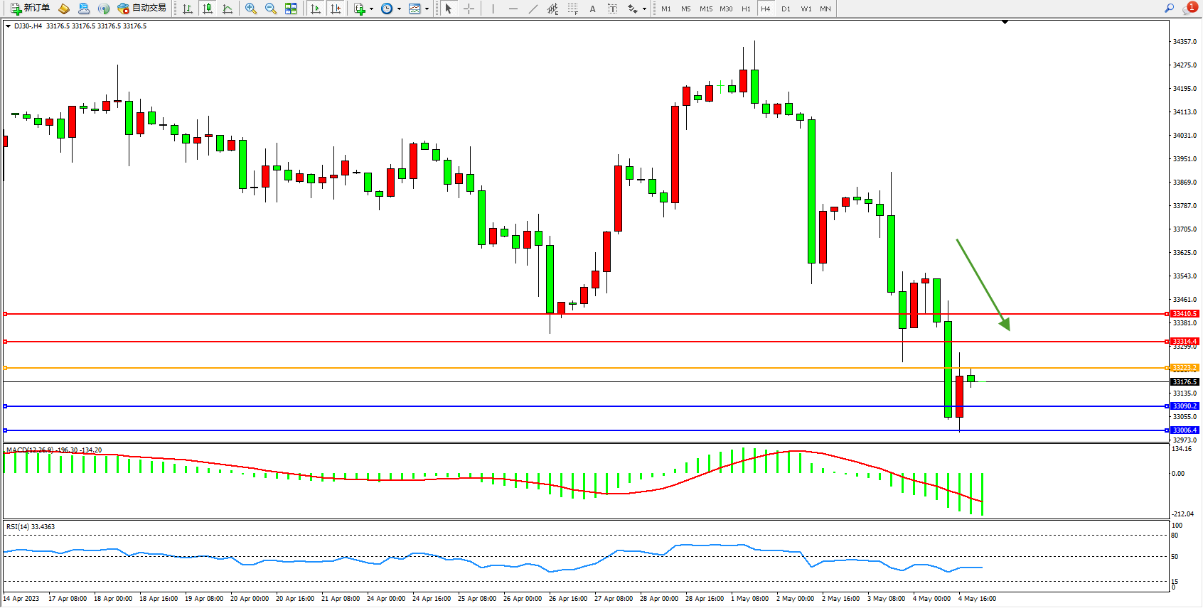 道琼斯指数DJ30——4小时K线图显示: