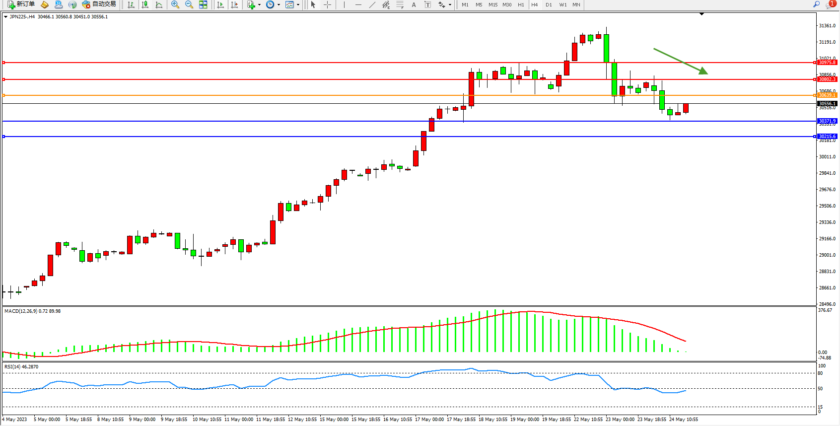 日经指数JPN225——4小时K线图显示: