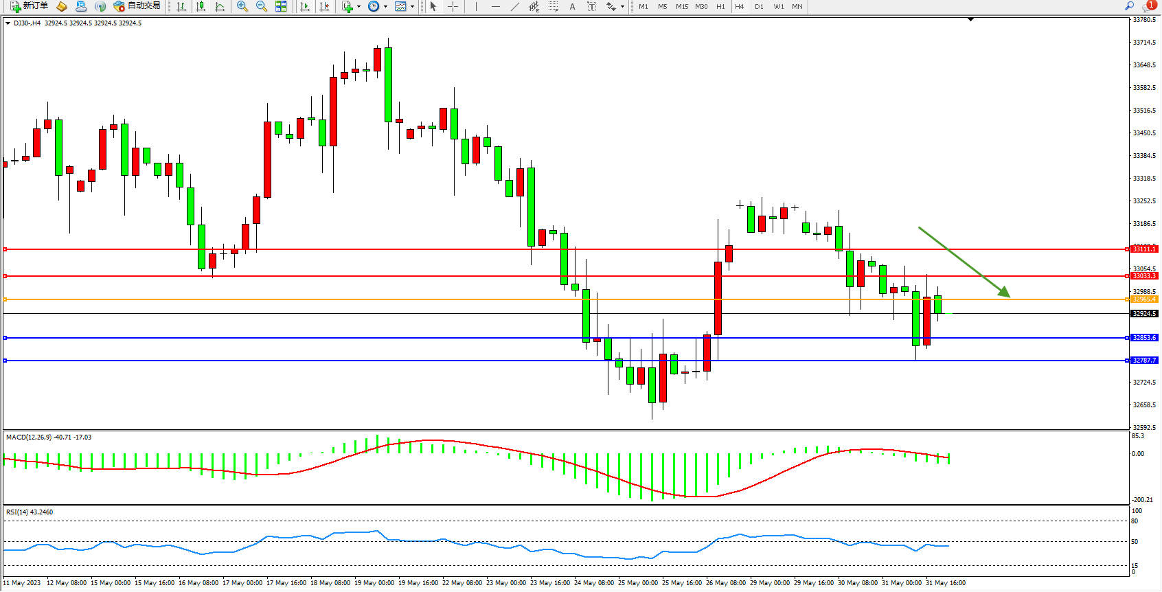 道琼斯指数DJ30——4小时K线图显示: