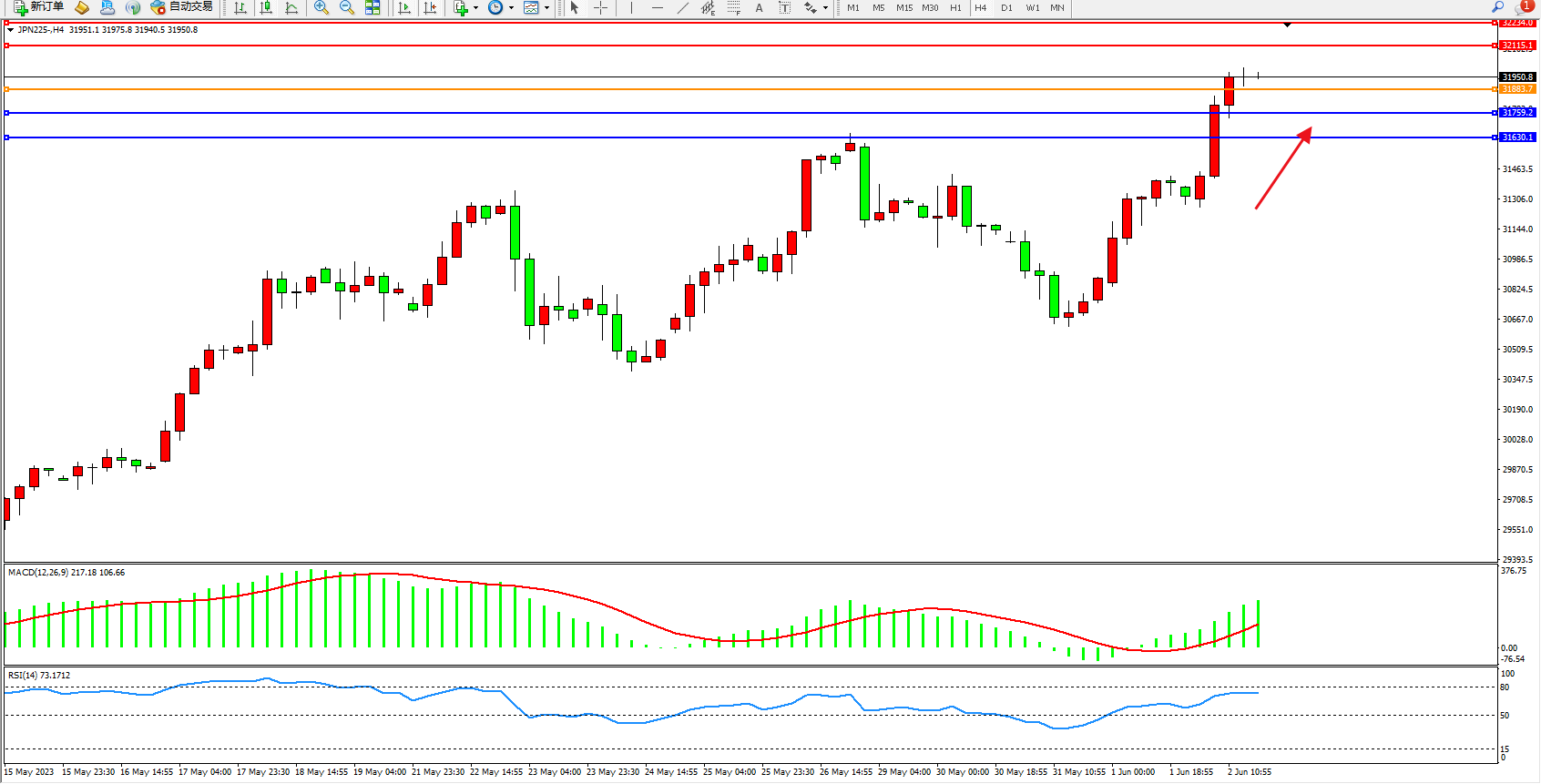 日经指数JPN225——4小时K线图显示: