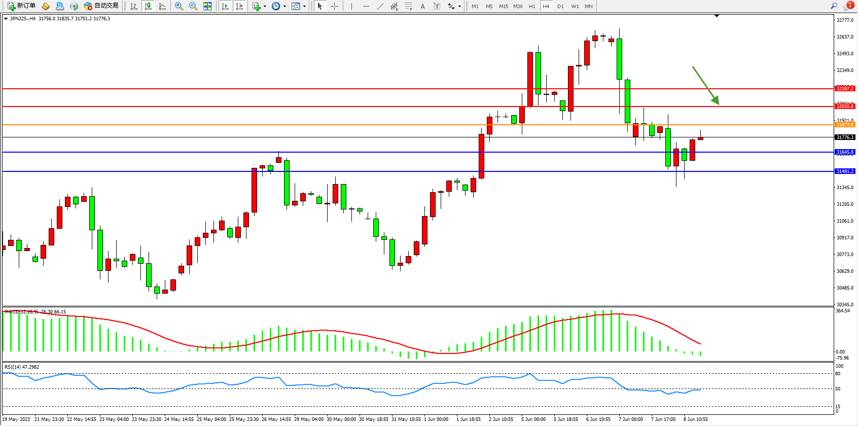 日经指数JPN225——4小时K线图显示: