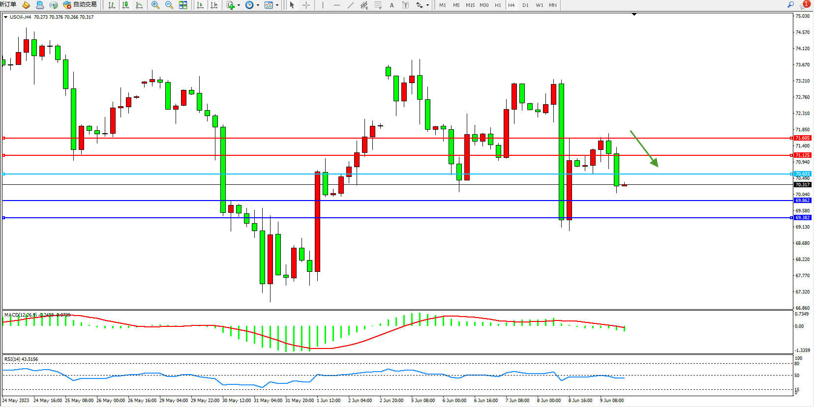 交易策略:70.603下方看跌,目标69.862 69.382