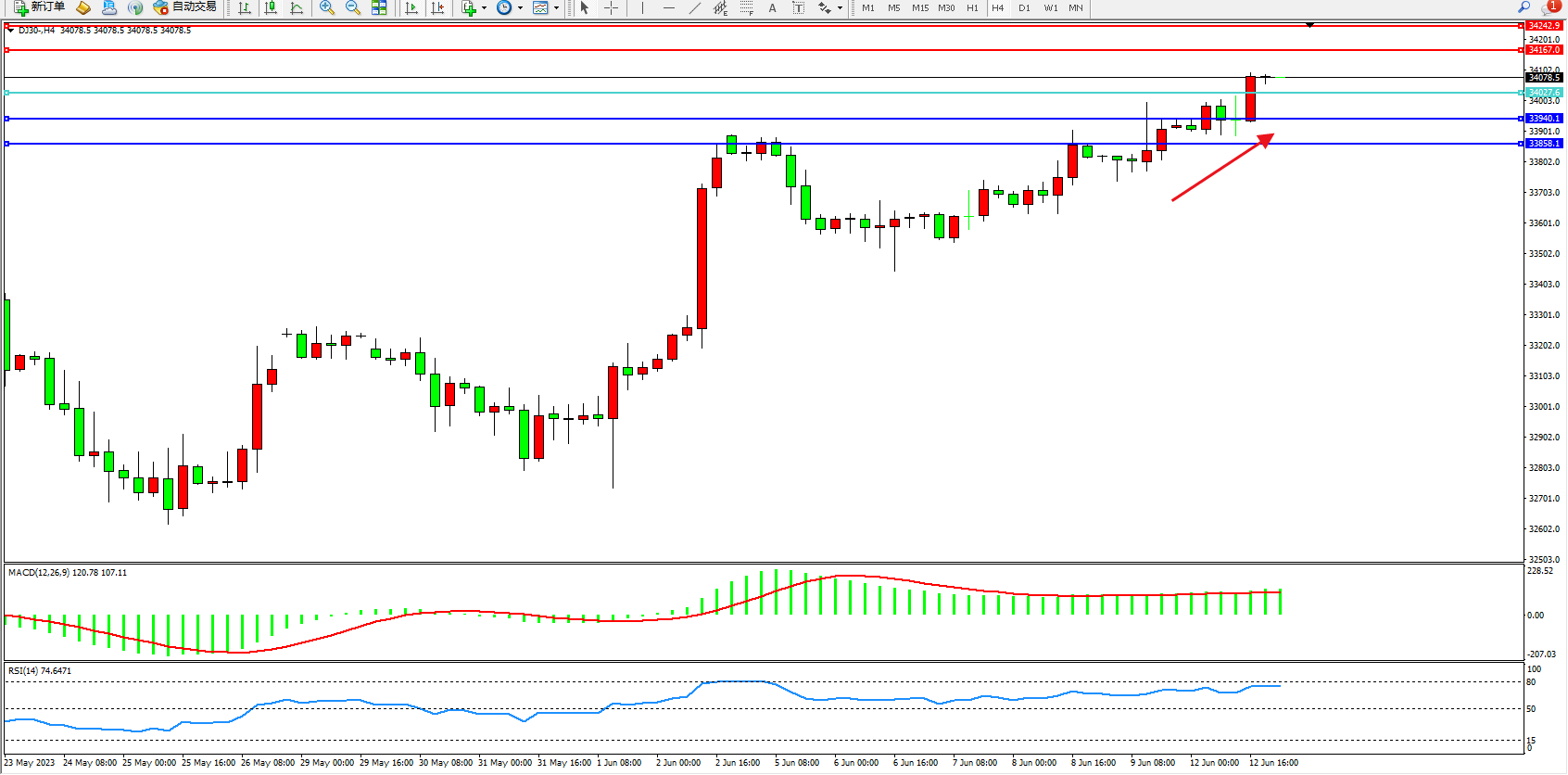 道琼斯指数DJ30——4小时K线图显示: