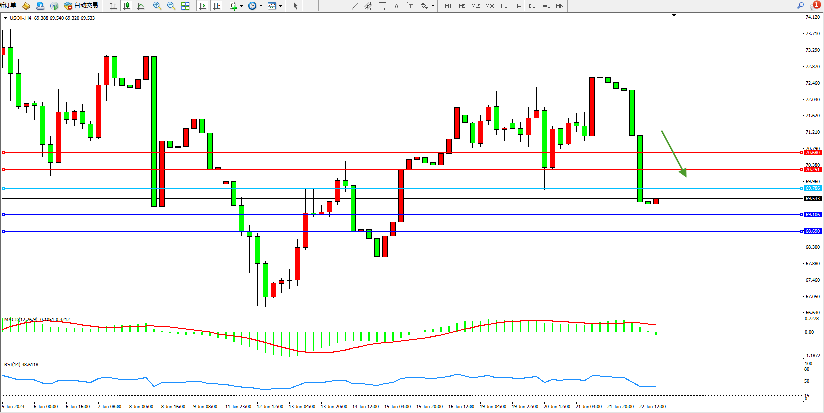 交易策略:69.786下方看跌,目标69.106 68.690