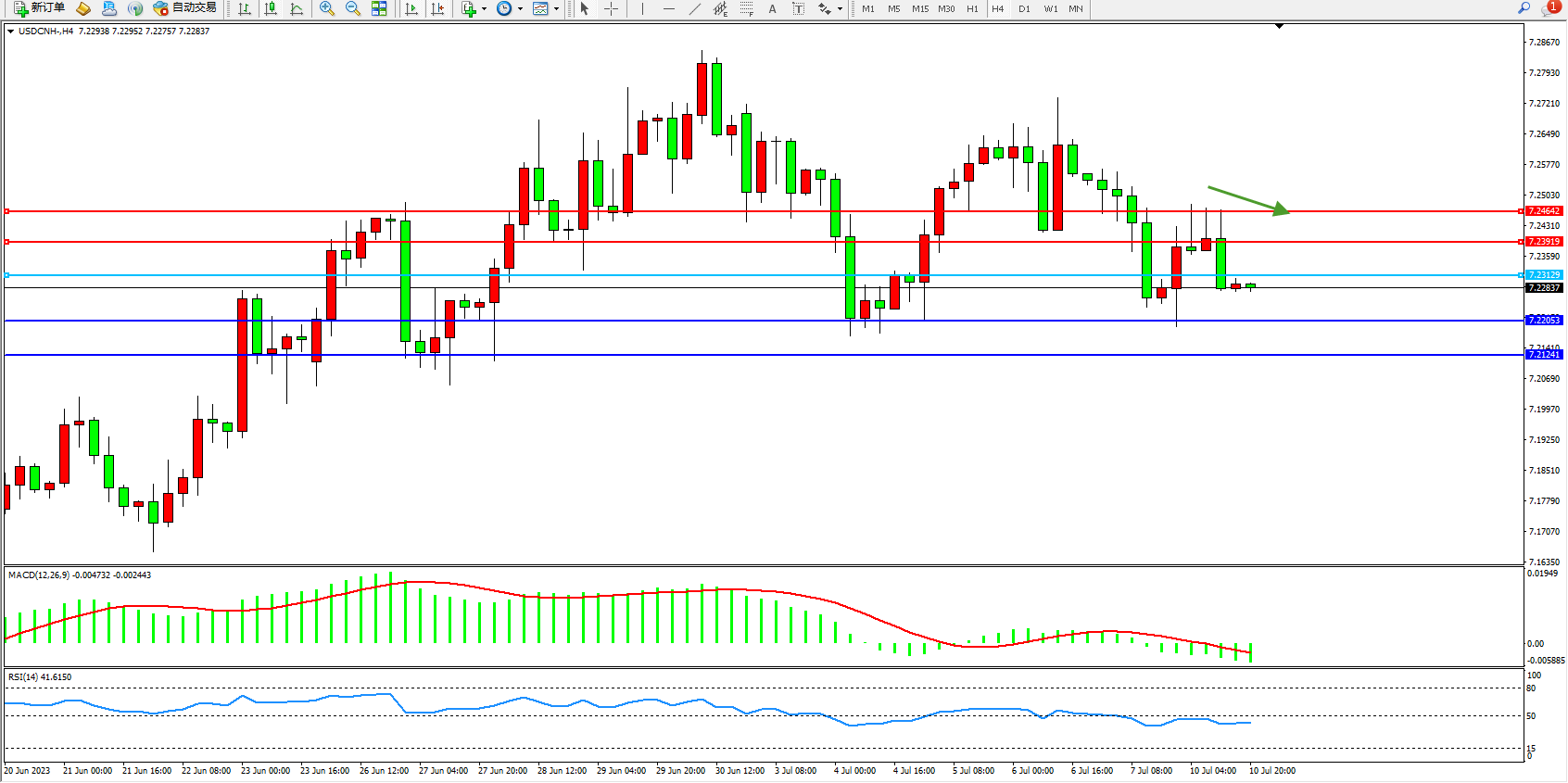 交易策略:7.23129下方看跌,目标7.22053  7.21241