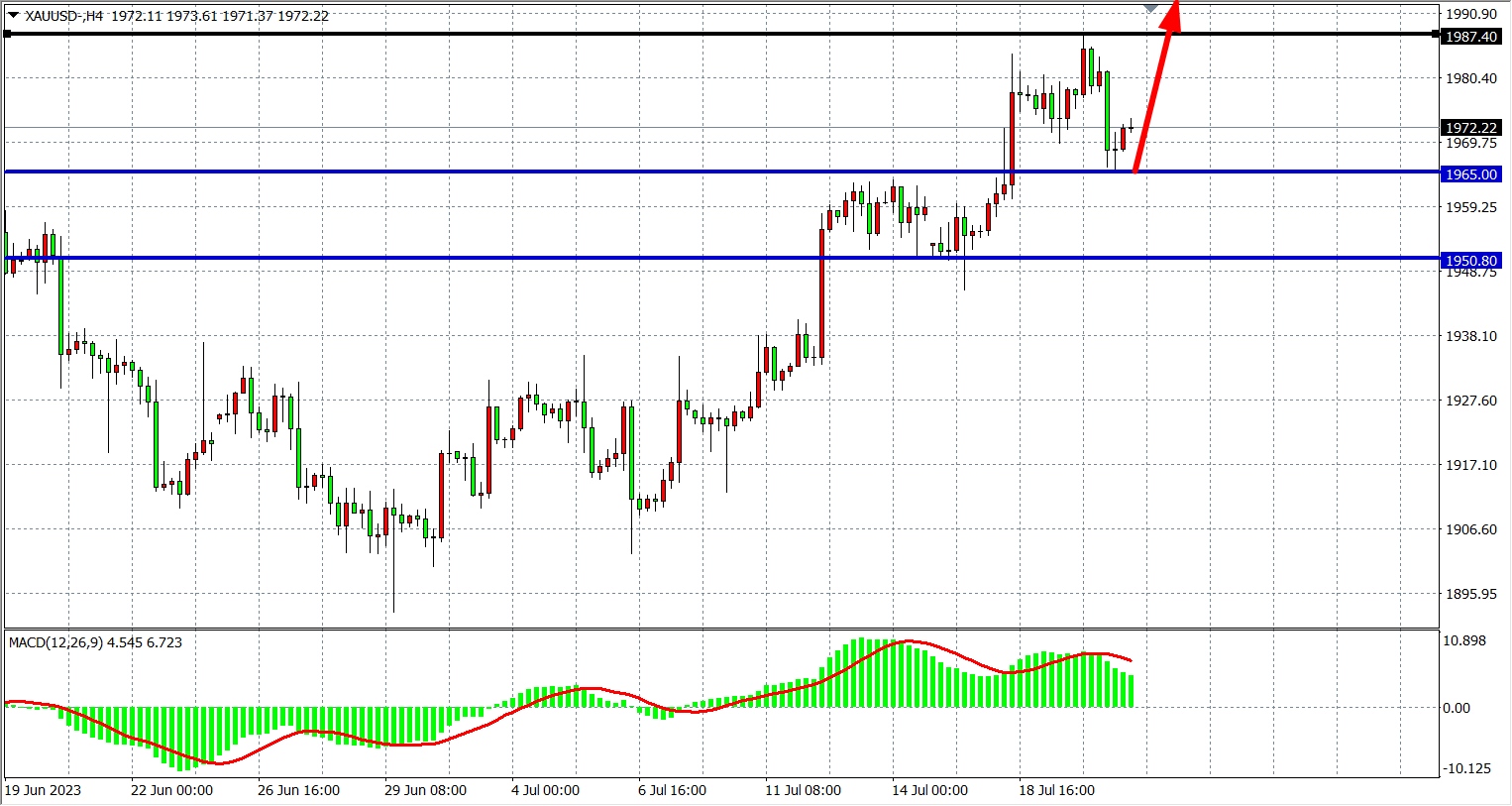 周四(7月20日)初请失业金人数不增反降,表明劳动力市场仍有弹性,可能支持美联储今年继续加息,美指受此提振收涨,现货黄金受美元和美债收益率走高的影响,从八周高位跌落,收跌0.38%。