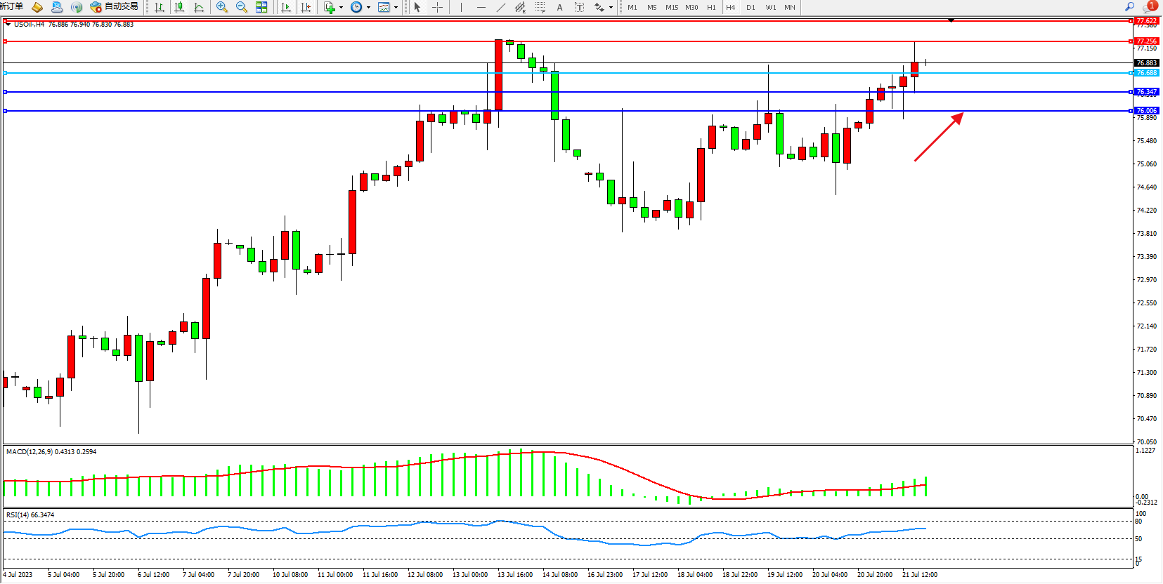 交易策略:76.688上方看涨,目标77.256  77.622