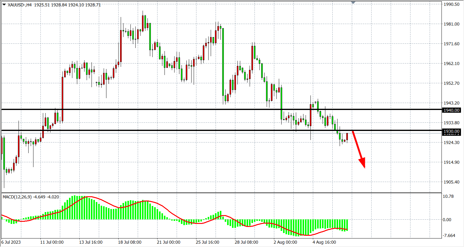 周二(8月8日)因中国公布的贸易数据令人失望,美国银行业的信用评级警告,以及一些疲弱的企业财报导致部分资金逃往美元和美国国债。美指创两周来最大单日涨幅,现货黄金震荡下行失守1930关口,创近一个月来新低,最终收跌0.58%。