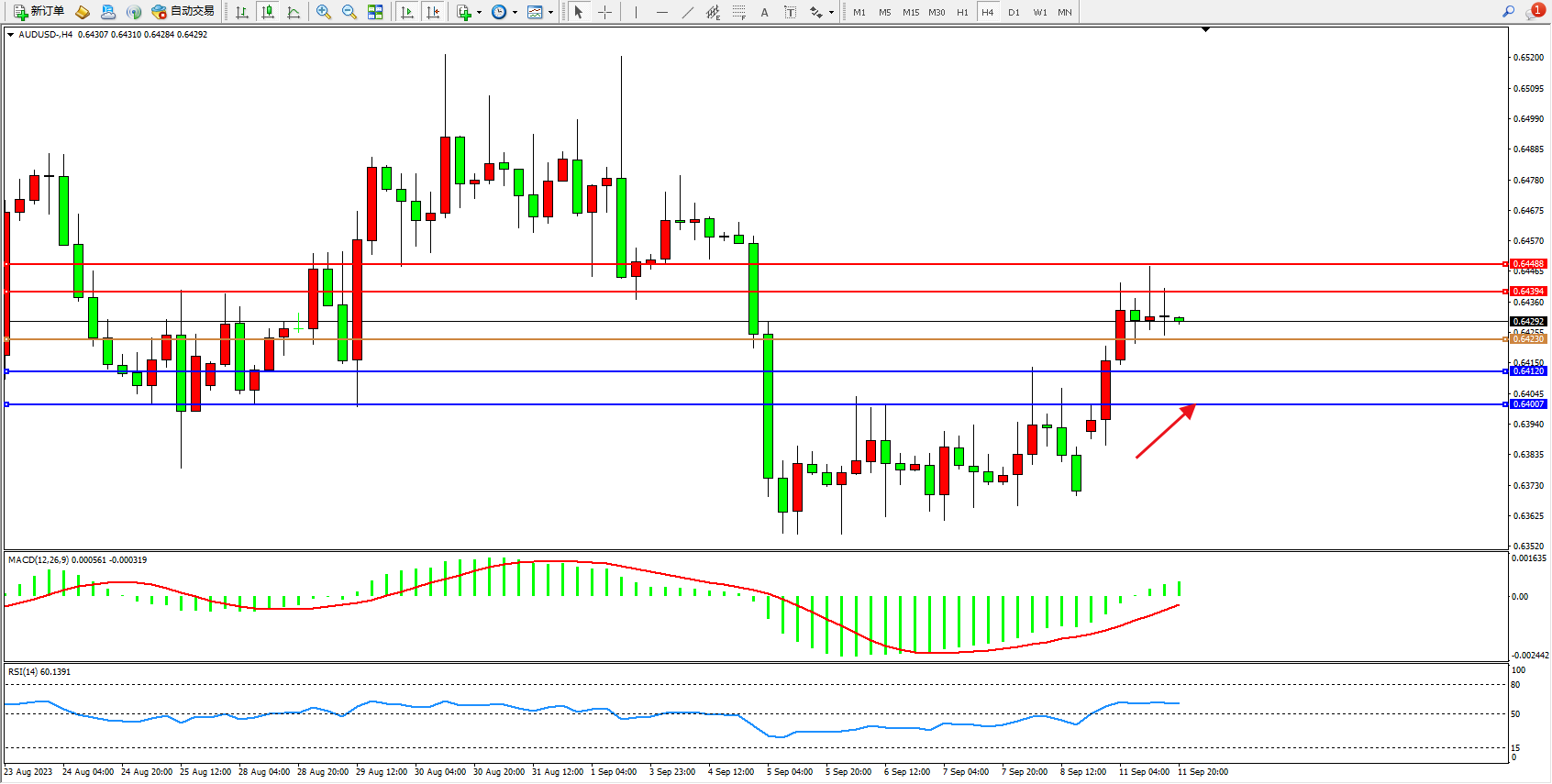 交易策略:0.64230上方看涨,目标0.64394  0.64488