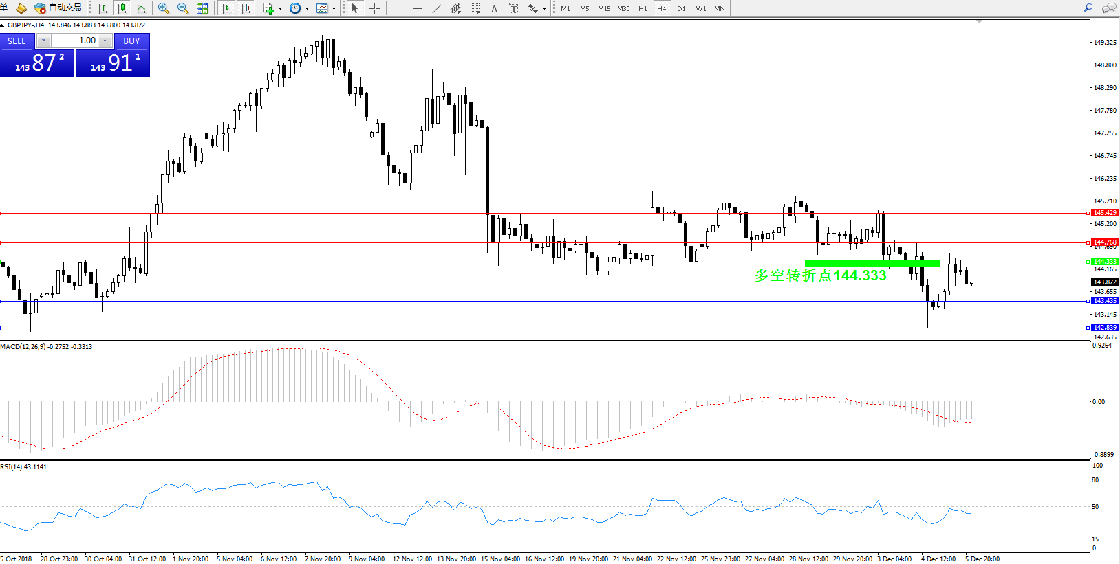 交易策略:144.333下方看跌,目标143.435142.839