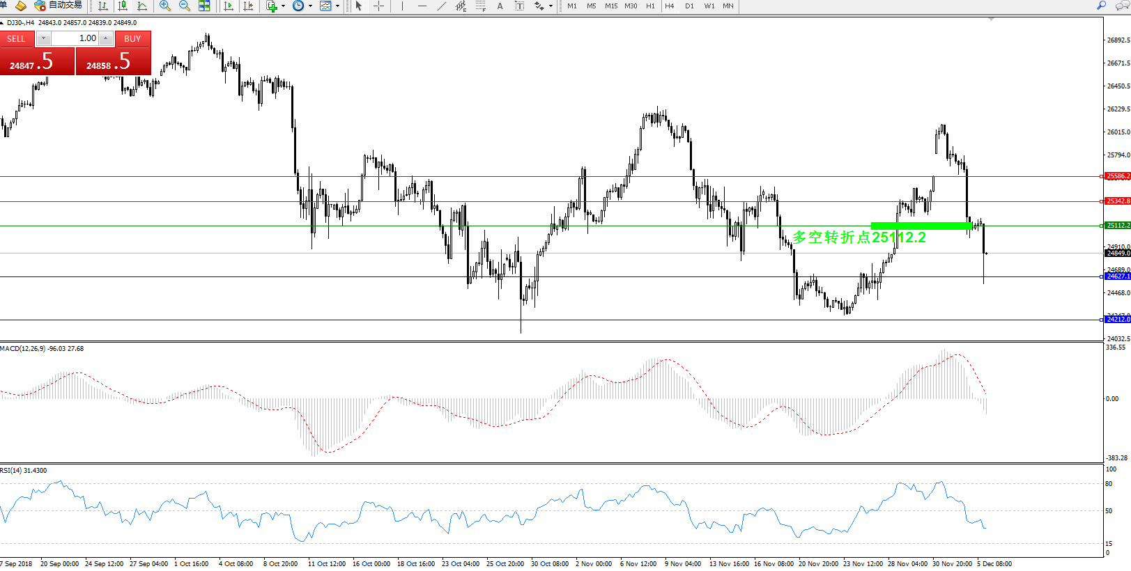 道琼斯指数DJ304小时K线图显示:
