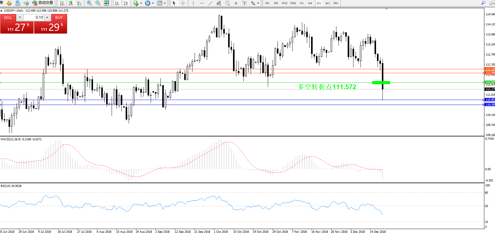 交易策略:111.572下方看跌,目标110.80、110.58