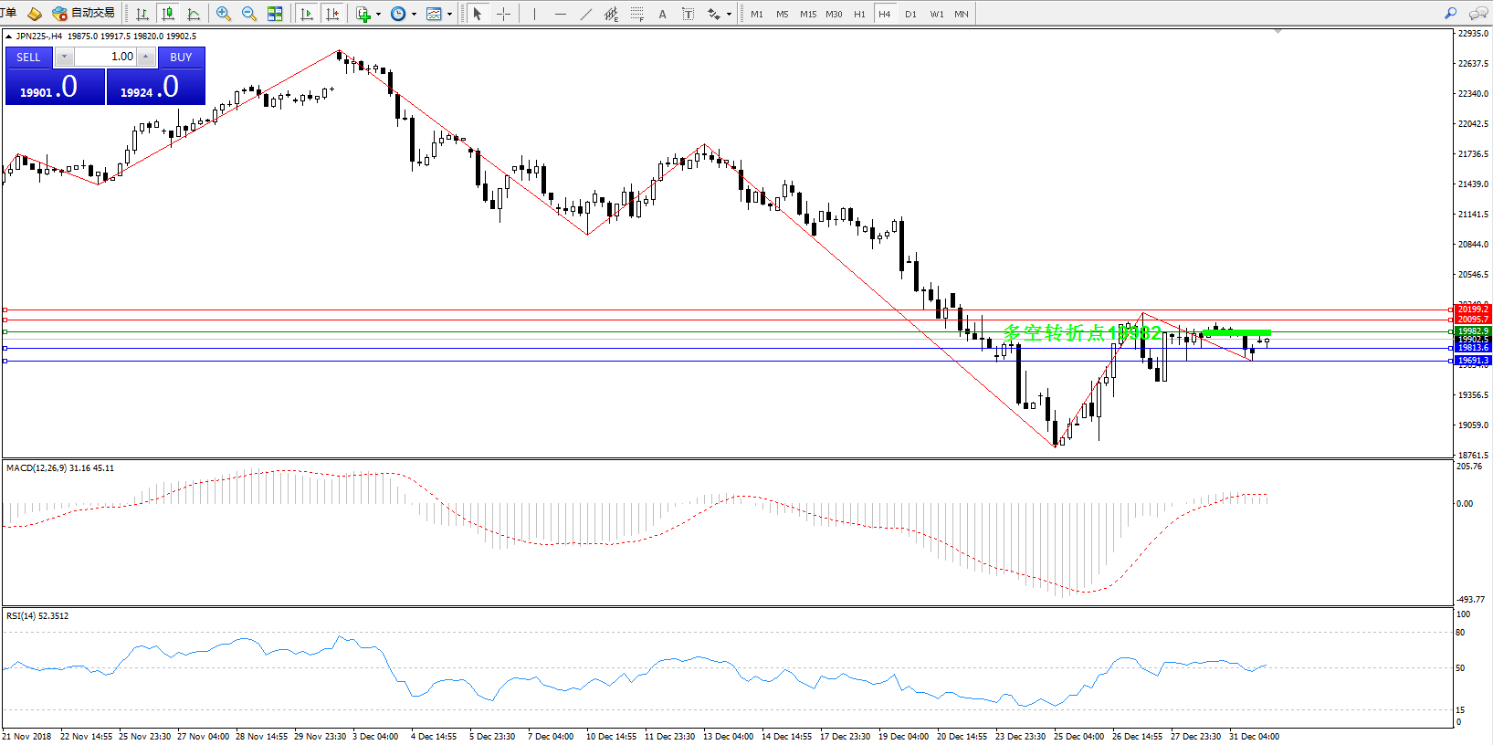 日经指数JPN225——4小时K线图显示: