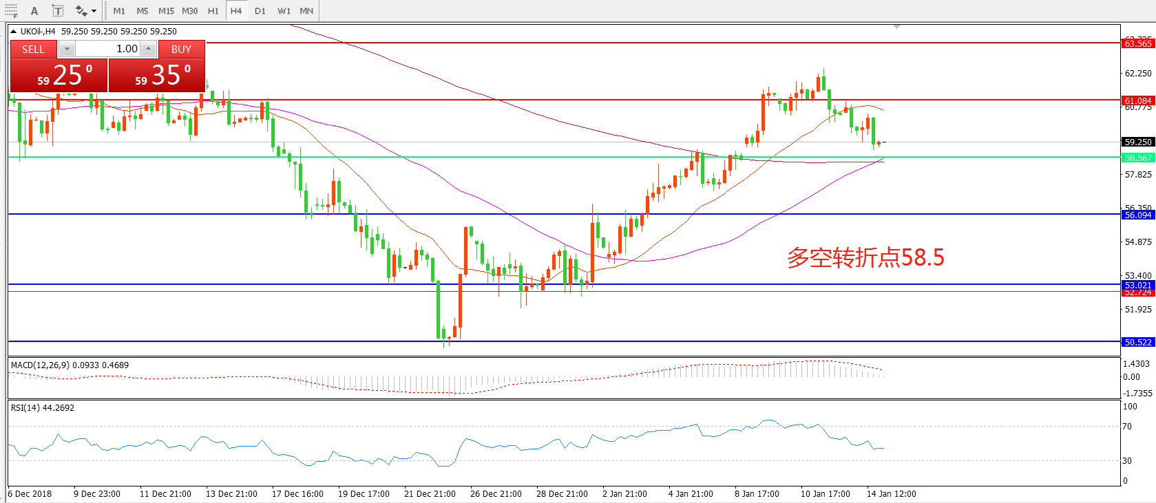 4小时图看,油价站稳58.5美金后稳步上行,冲击61美元后小幅回落, 均线系统仍呈多头排列,MACD红柱缩短,短线有回落风险。